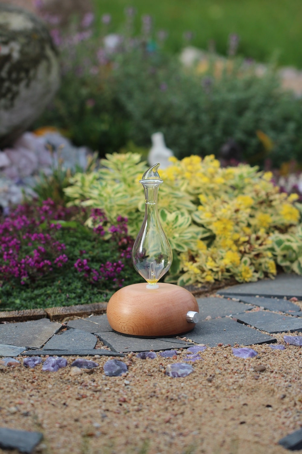 - Paigalda klaasist pihustuspudel puidust alusele ja lisa seade vooluvõrku (kontrolli, et pihustuspudel oleks kindlalt paigaldatud seadmele)