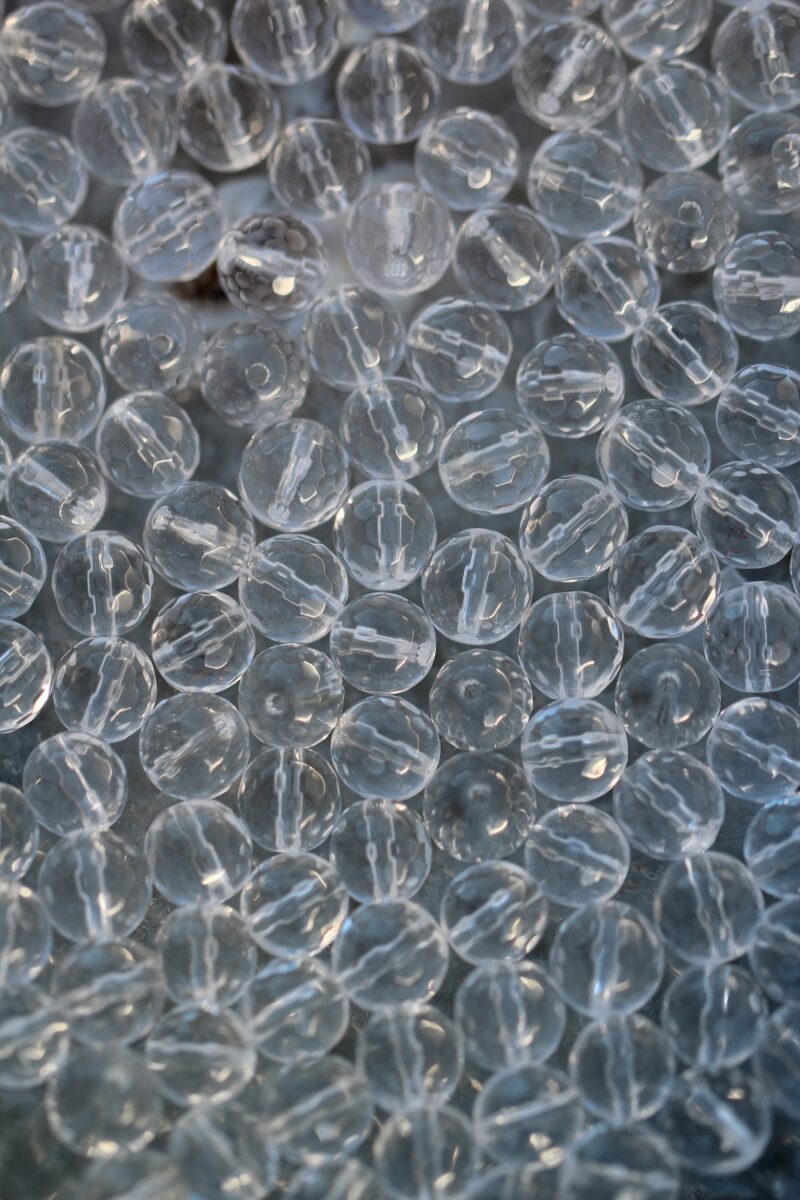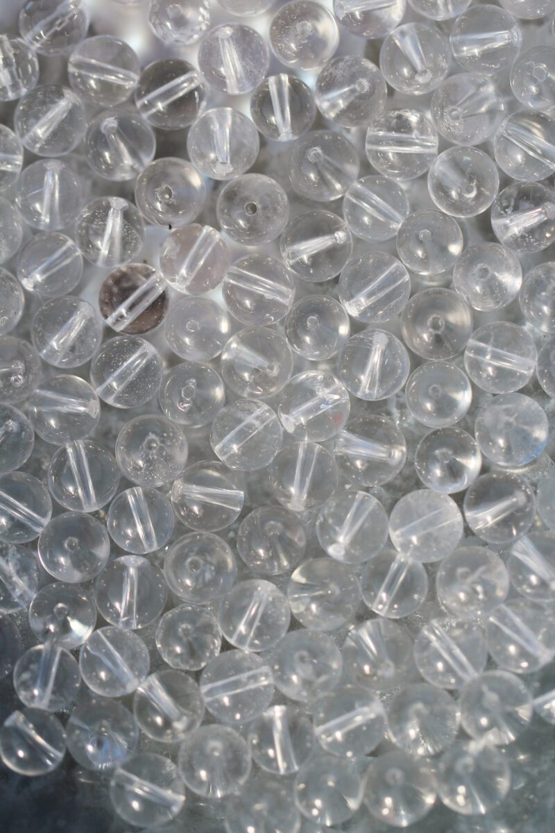 Säravalt puhta ja läbipaistva struktuuriga mäekristalli auguga helmed, mis on sobilikud ehete (käe- ja kaelakeed) valmistamiseks.