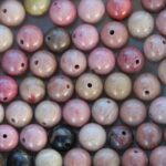 Punakas roosa ja pruunide varjunditega looduslikud rodoniidi auguga helmed, mis on sobilikud ehete (käe- ja kaelakeed) valmistamiseks.