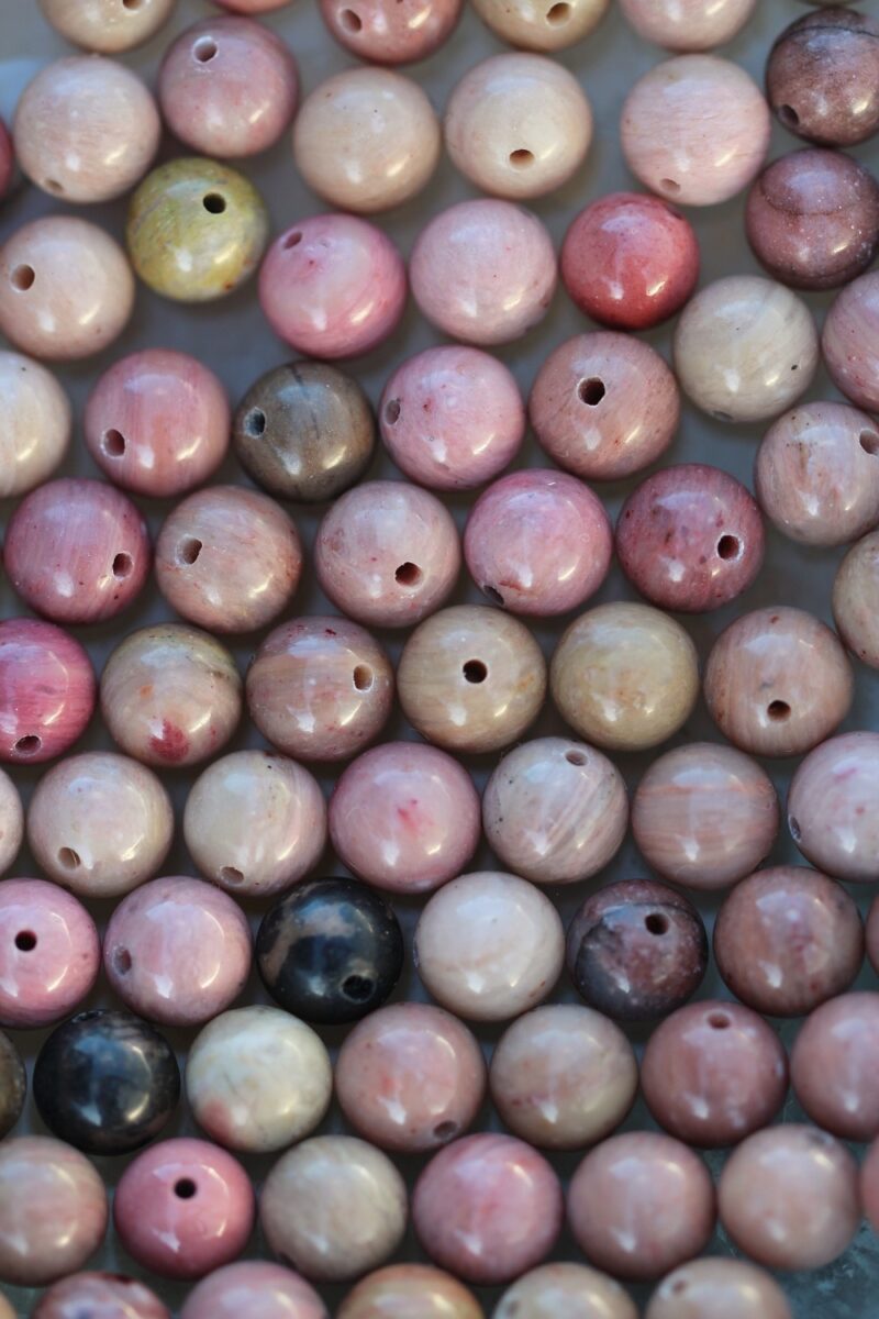 Punakas roosa ja pruunide varjunditega looduslikud rodoniidi auguga helmed, mis on sobilikud ehete (käe- ja kaelakeed) valmistamiseks.