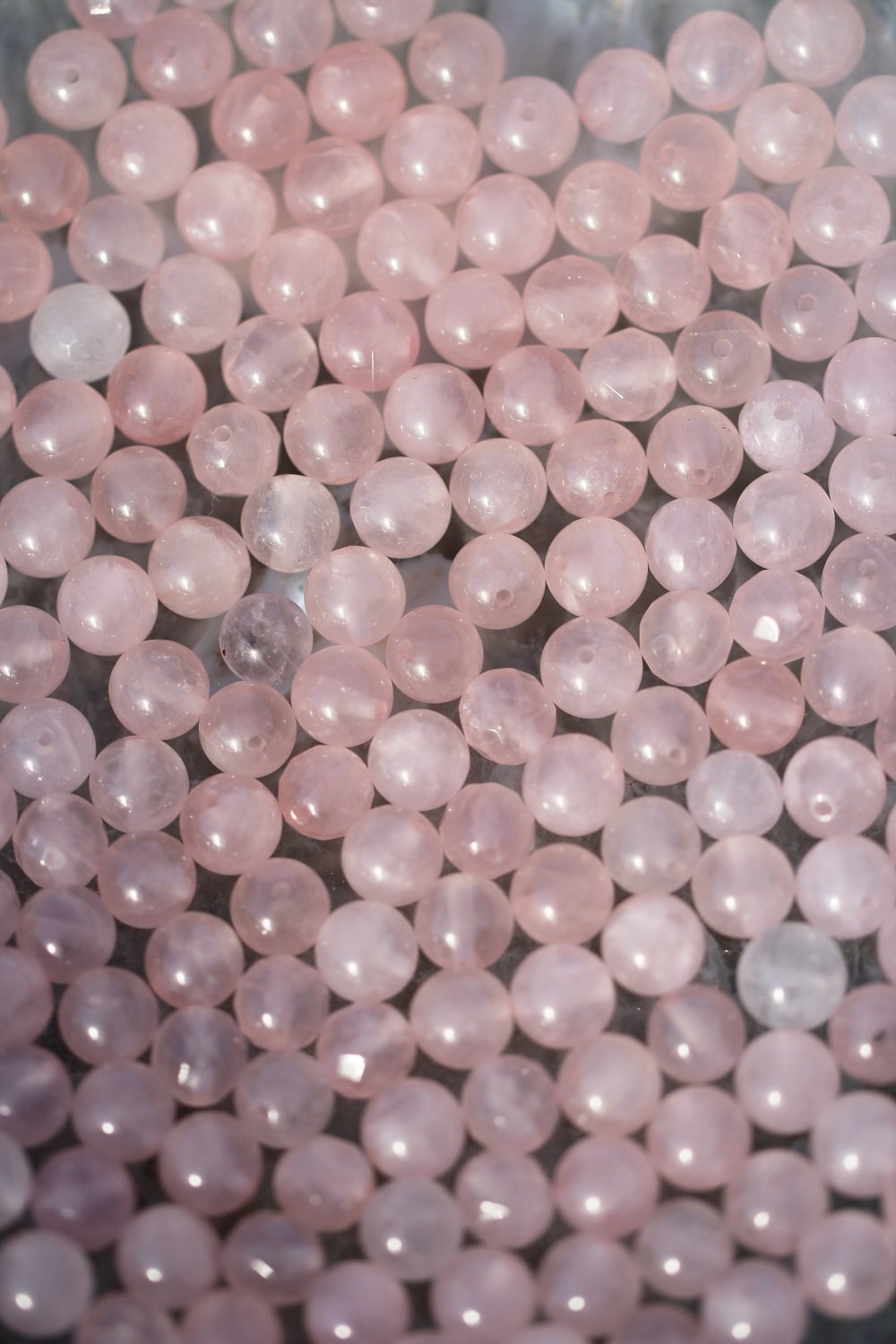 Looduslikud ja pehmelt intensiivse roosa tooniga roosa kvarts auguga helmed, mis on sobilikud ehete (käe- ja kaelakeed) valmistamiseks.