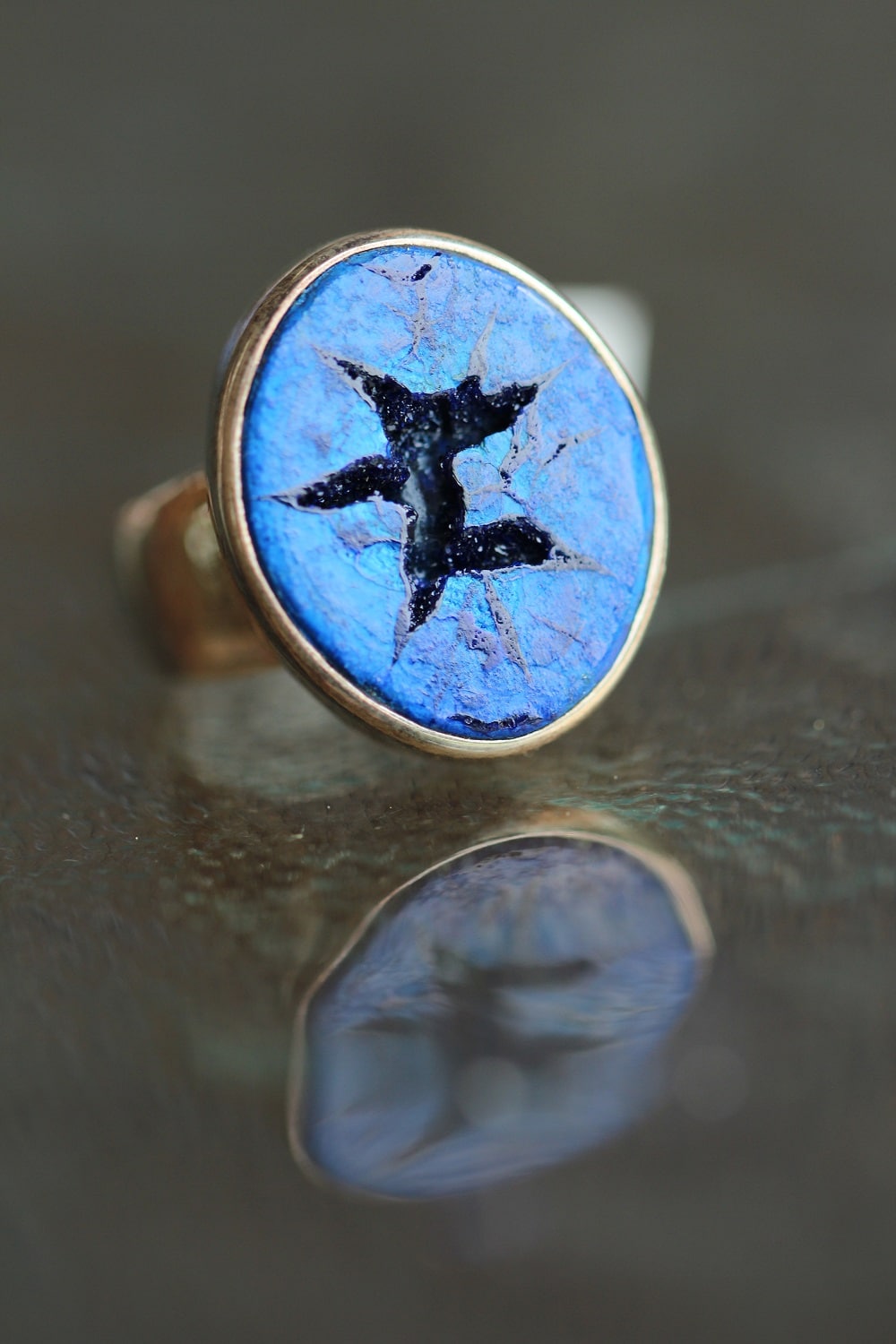 Selle sõrmuse kristall on azuriit – soodustab eneseteadlikkust ja sisemist tasakaalu.