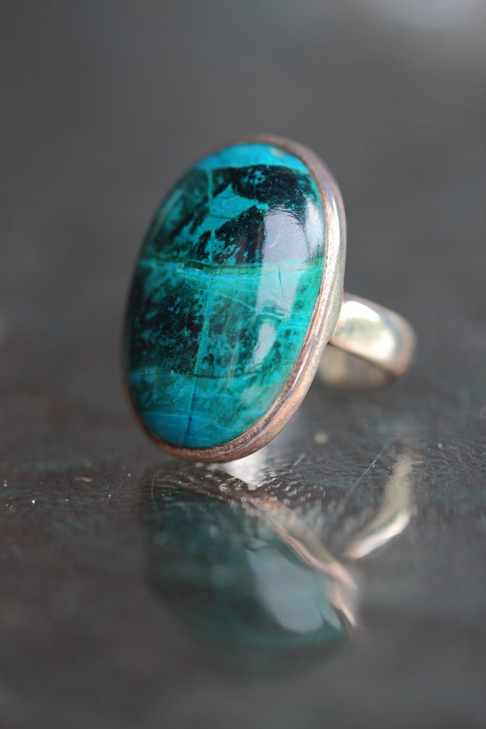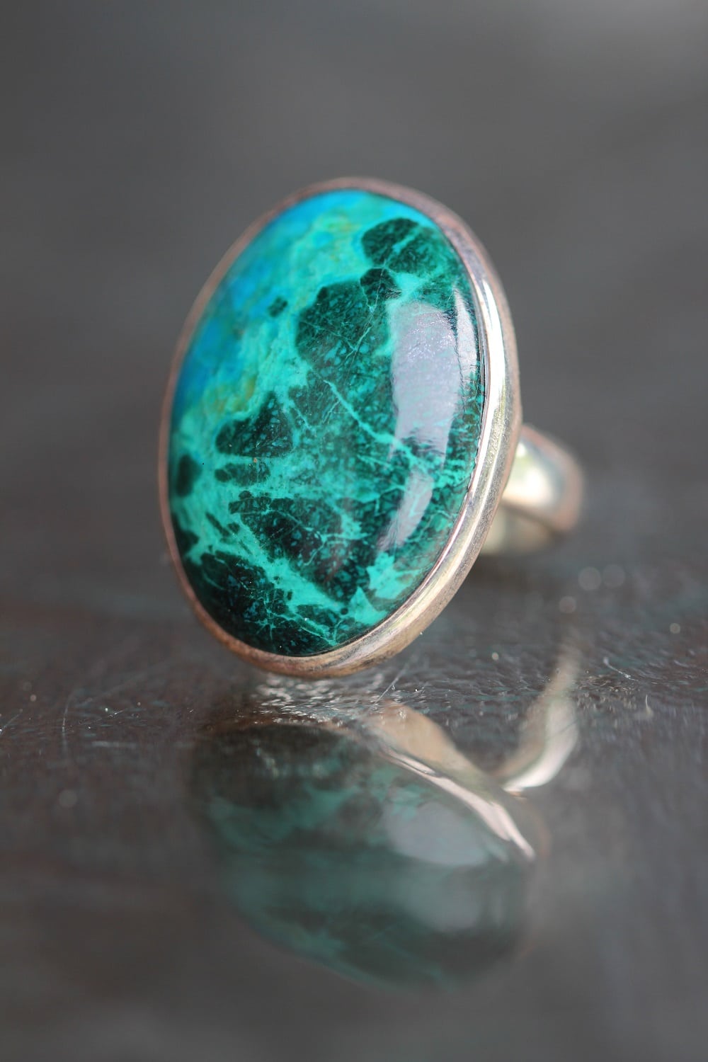 Selle sõrmuse kristall on krüsokolla – soodustab eneseteadlikkust ja sisemist tasakaalu.