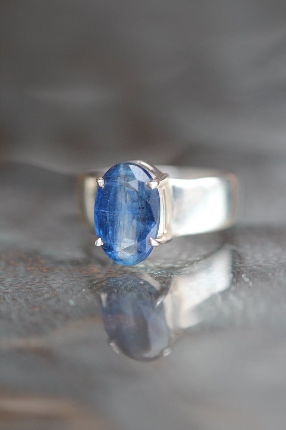 Selle sõrmuse kristall on sinine küaniit – suhtlemise ja loogika kivi.