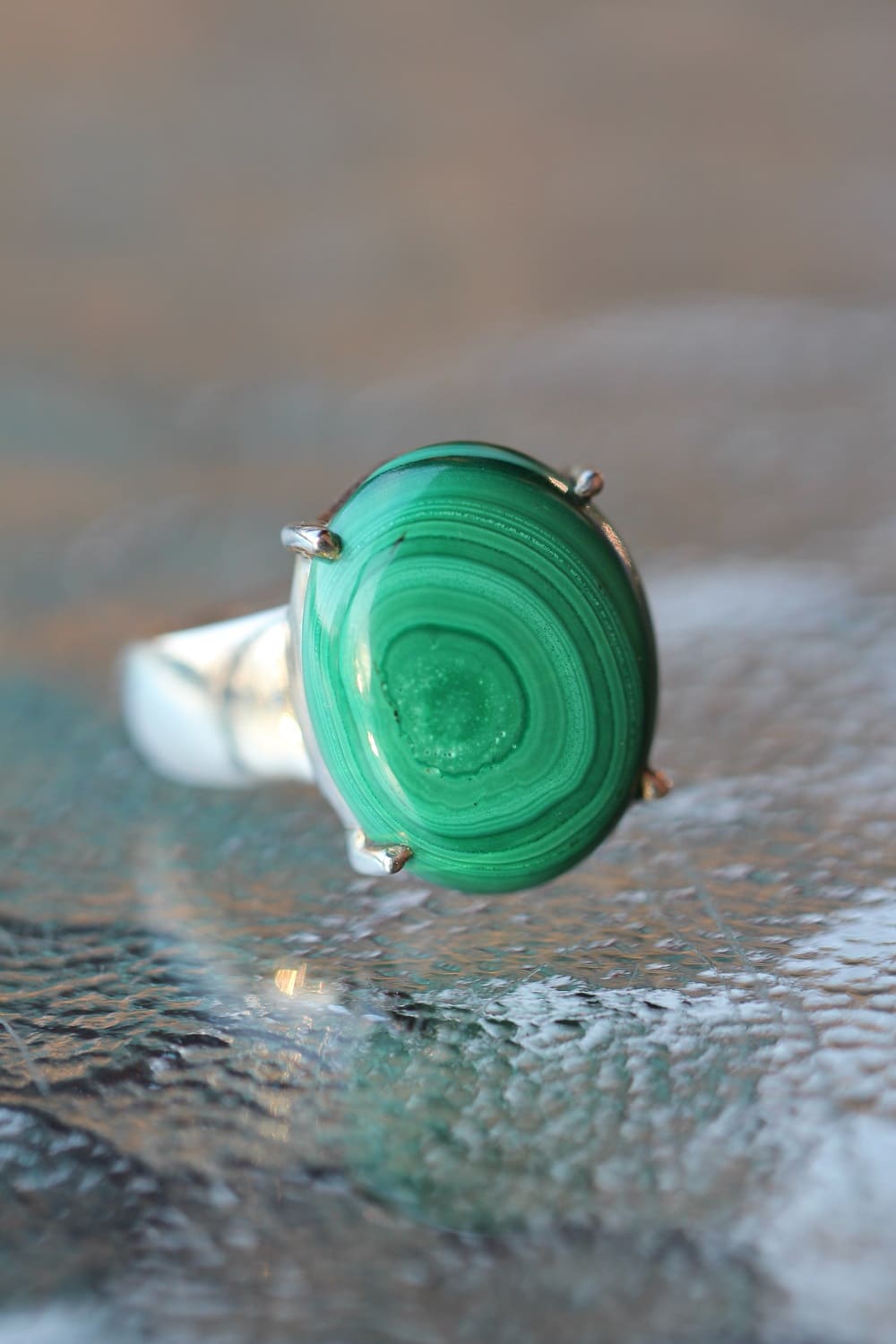 Selle sõrmuse kristall on malahhiit– mitmekülgne tervendaja ja südame tarkuse kivi.