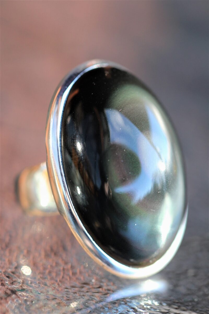 Selle sõrmuse kristall on vikerkaareobsidiaan – puhastaja ja muutuste toetaja.