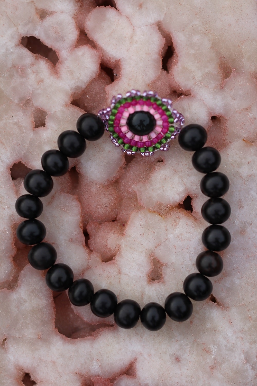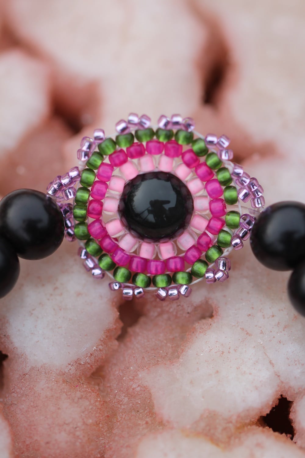 Käekees on kokku punutud helmestikand, obsidiaan, must eeben ja siid.