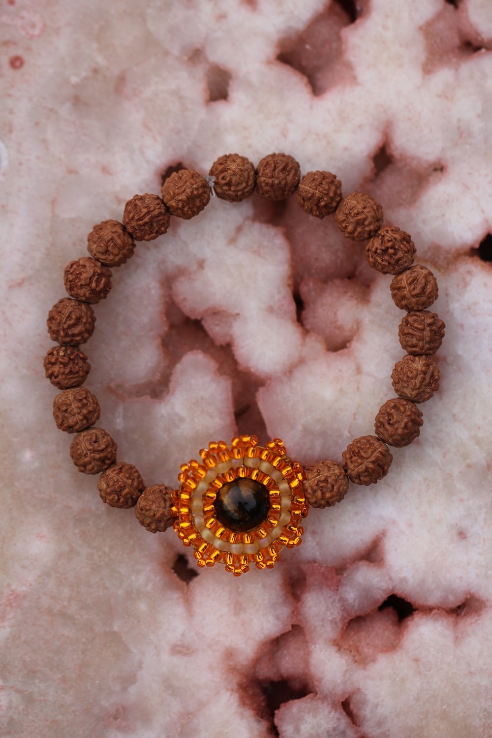 Väekees on kokku punutud helmestikand, tiigrisilm, rudraksha ja siid.