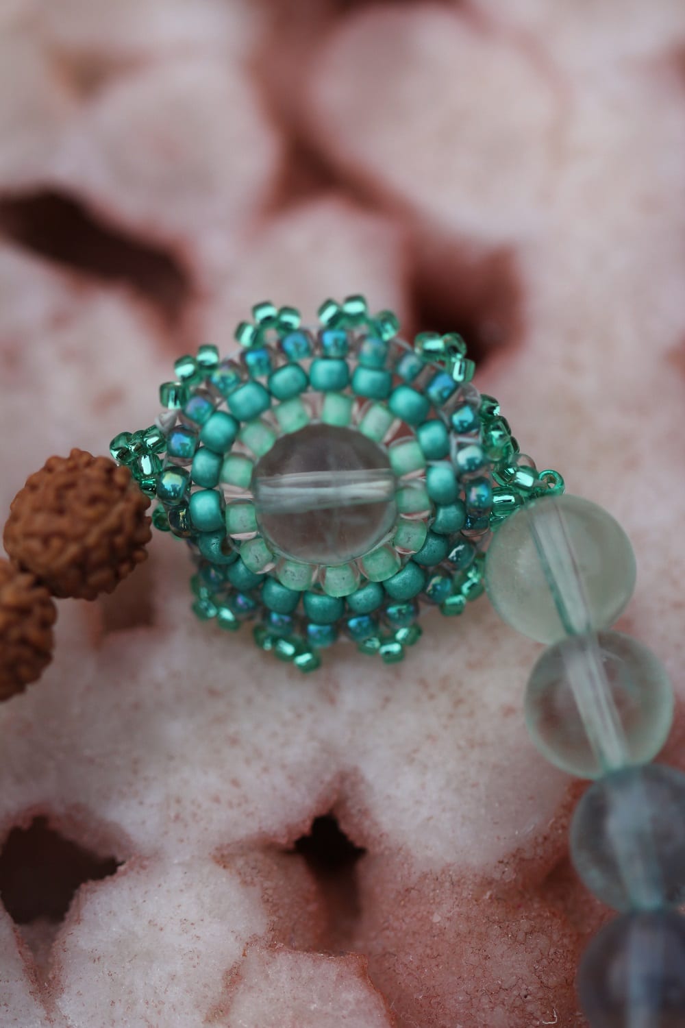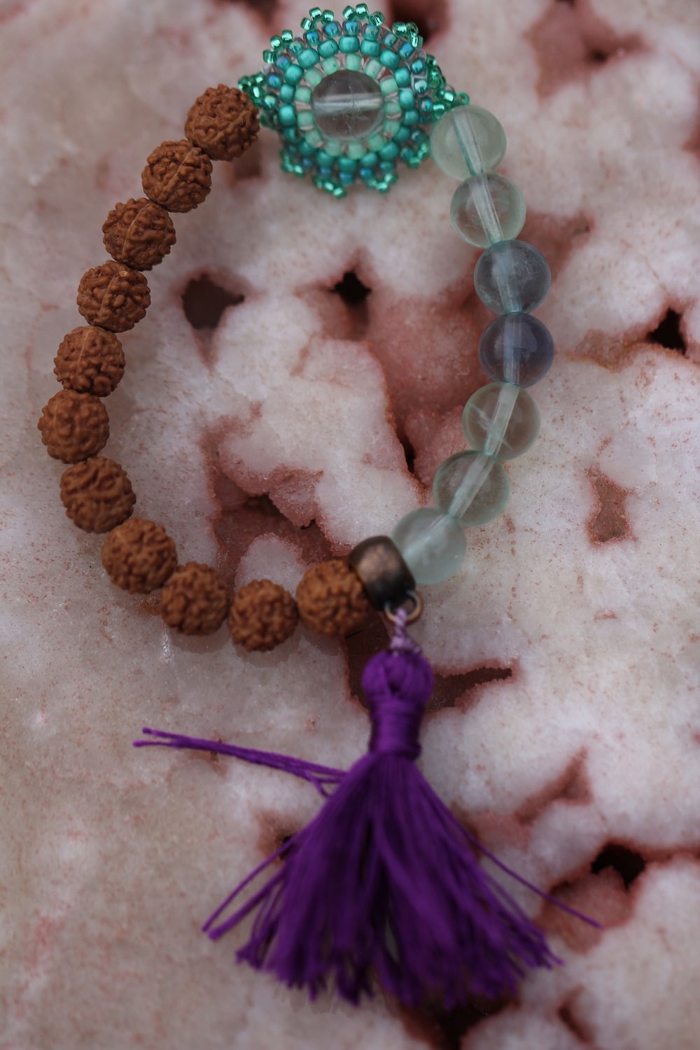 Käekees on kokku punutud helmestikand, fluoriit, rudraksha ja siid.