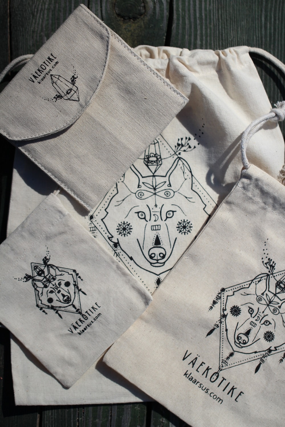 Materjal Orgaaniline puuvill, 150-300 gsm, ühepoolne trükk, pealt suletavad puuvillast paelaga (3 suurust) ja ümbrik-tüüpi pealt krõpsuga kinnitatav (1 suurus).