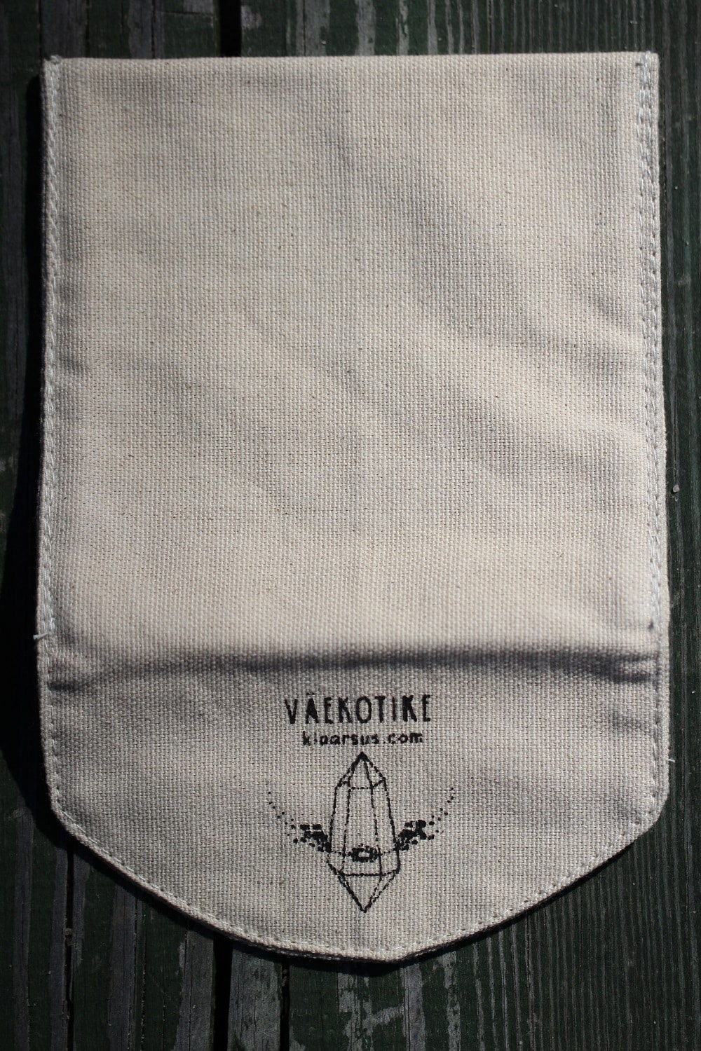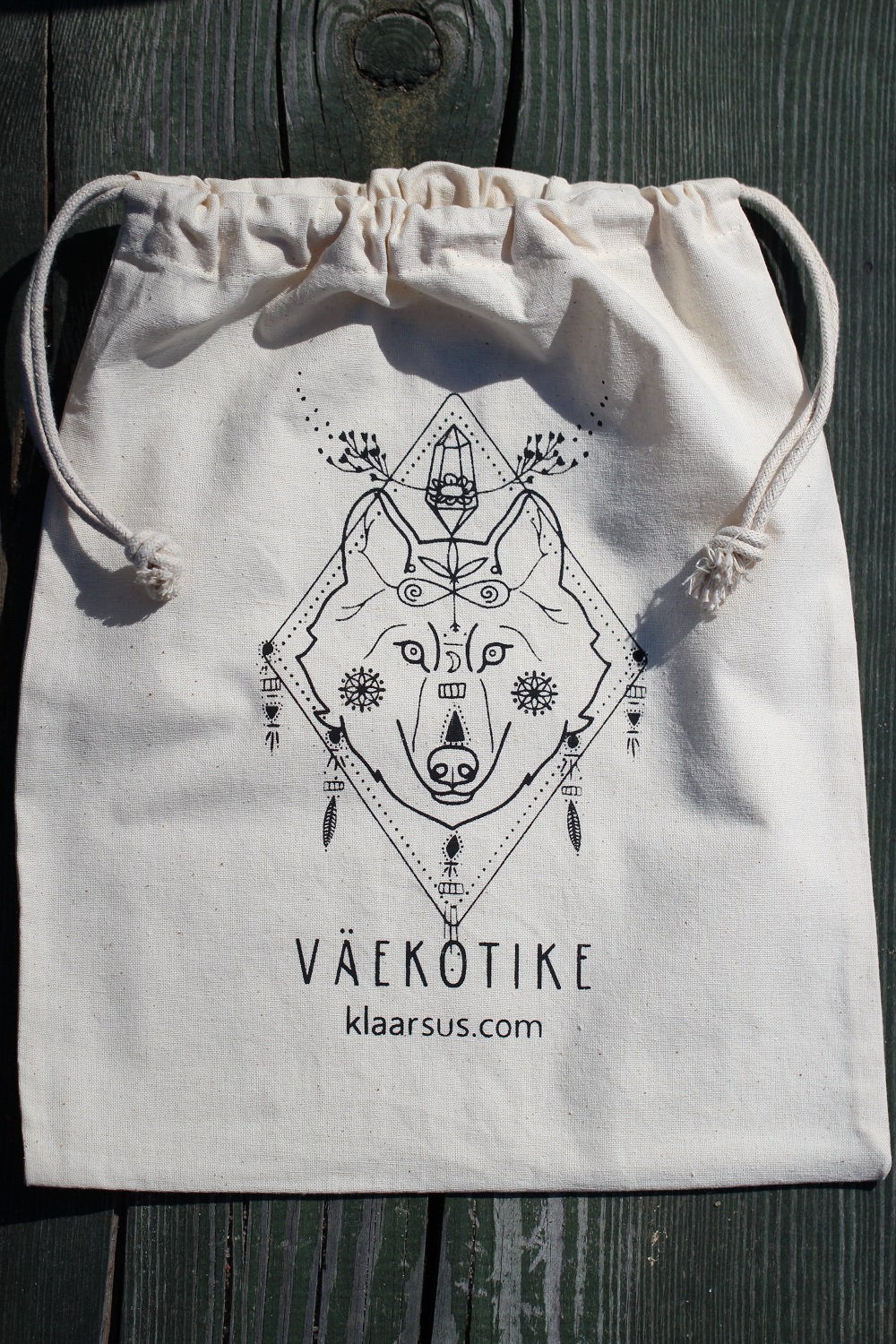 Koostis: Orgaaniline puuvill, 150-300 gsm., ühepoolne trükk, pealt suletavad puuvillast paelaga (3 suurust) ja ümbrik-tüüpi pealt krõpsuga kinnitatav.