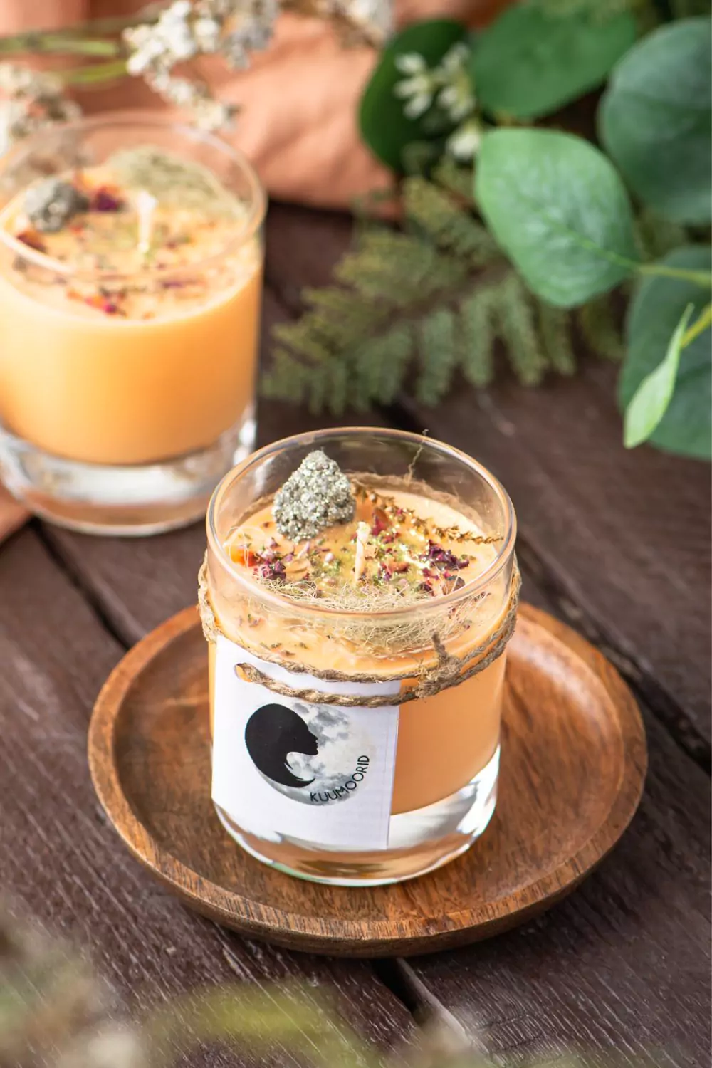 Lõhnaküünla oranž toon toob iseenesest naeratuse näole ja sädeme silmisse.
