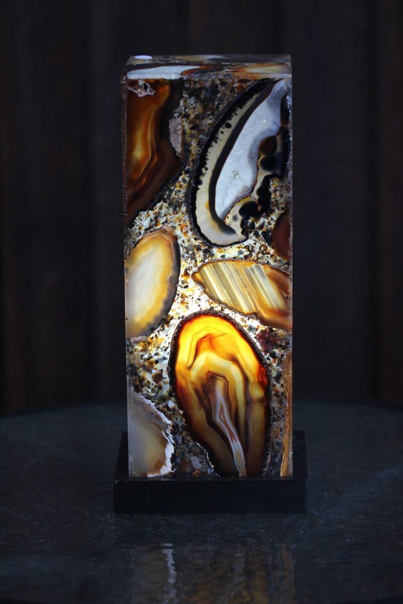 Naturaalsest poleeritud ahhaadi plaatidest ja epoksiidvahaga seotud plaatidest valmistatud lamp, mis toob esile ahhaadi ainulaadse struktuuri ning värvid kõigist neljast küljest.