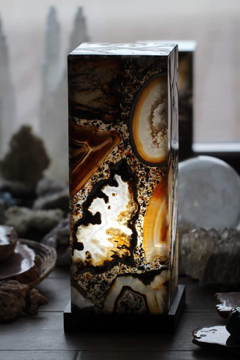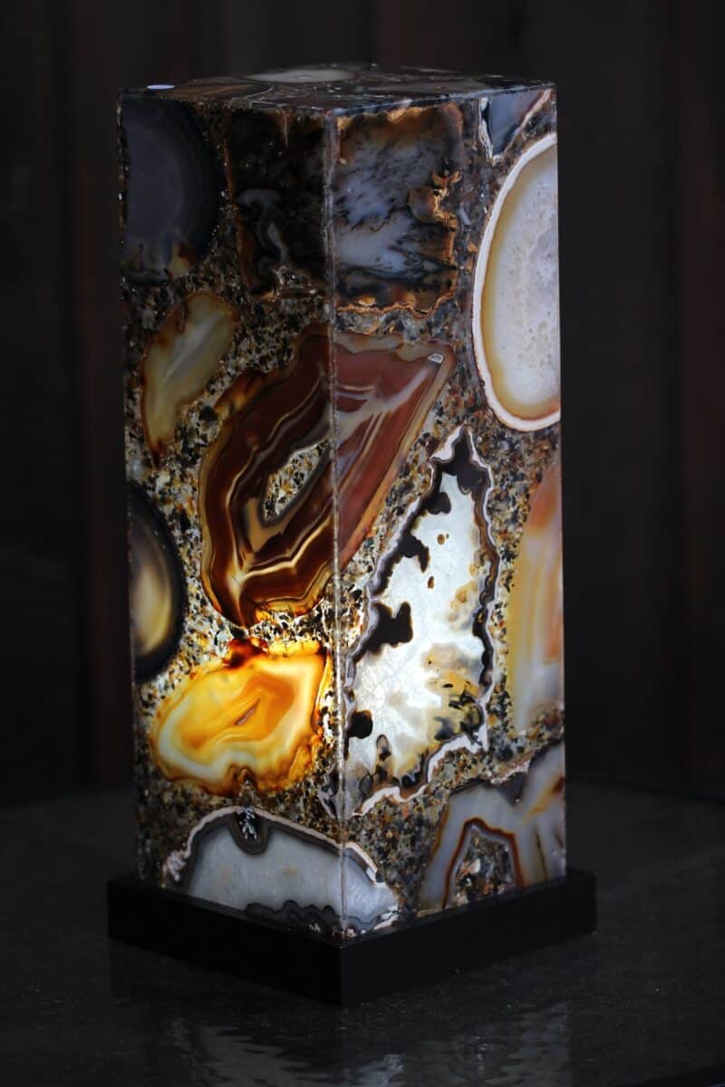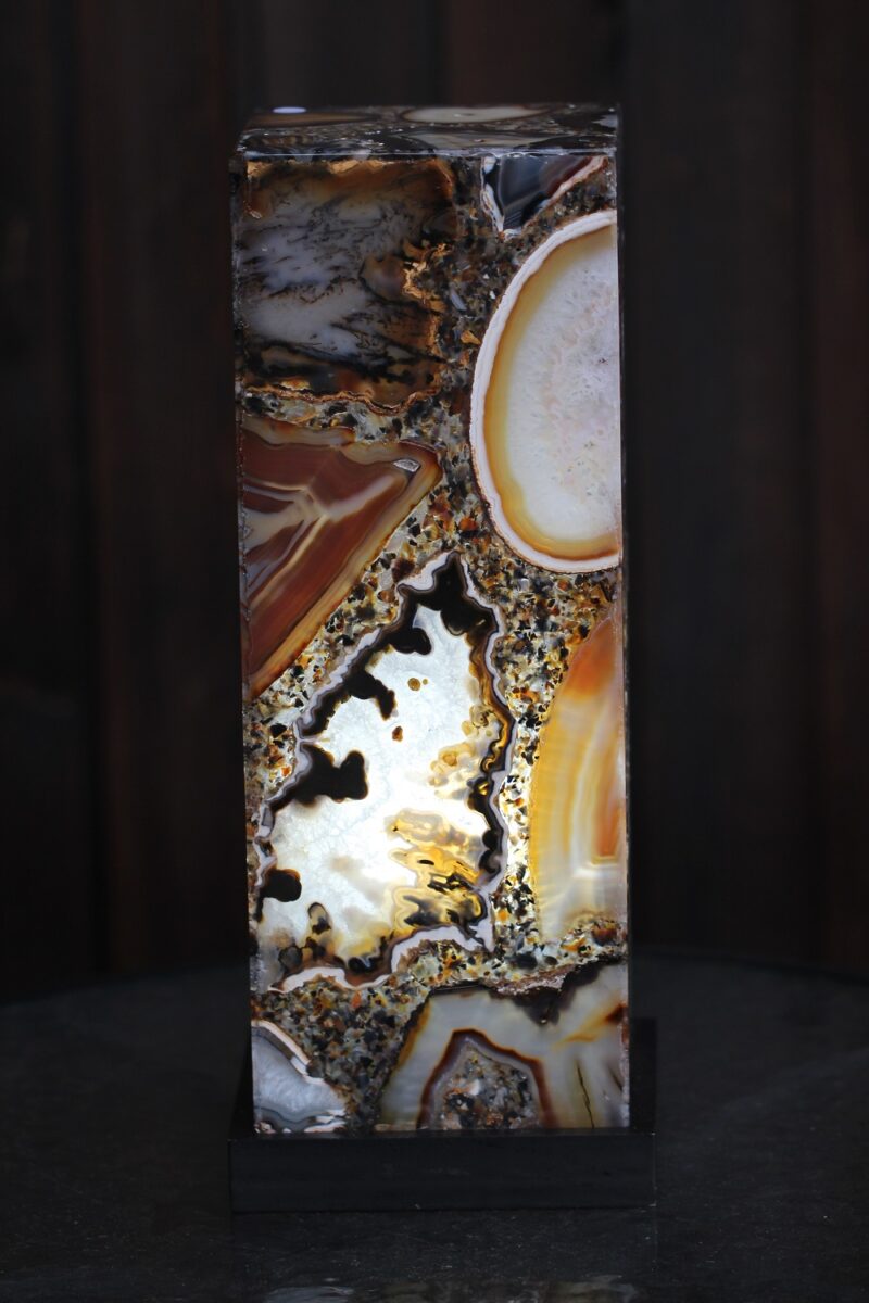 Naturaalsest poleeritud ahhaadi plaatidest ja epoksiidvahaga seotud plaatidest valmistatud lamp, mis toob esile ahhaadi ainulaadse struktuuri ning värvid kõigist neljast küljest.