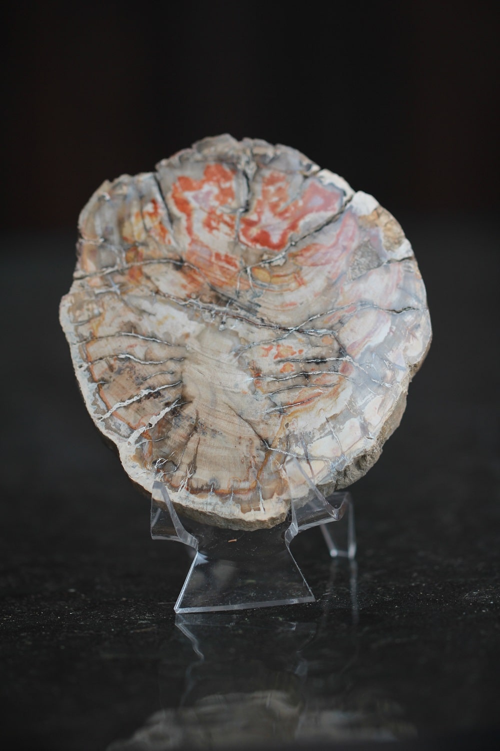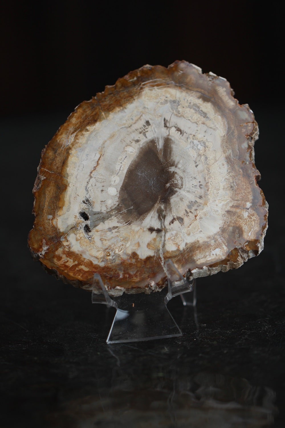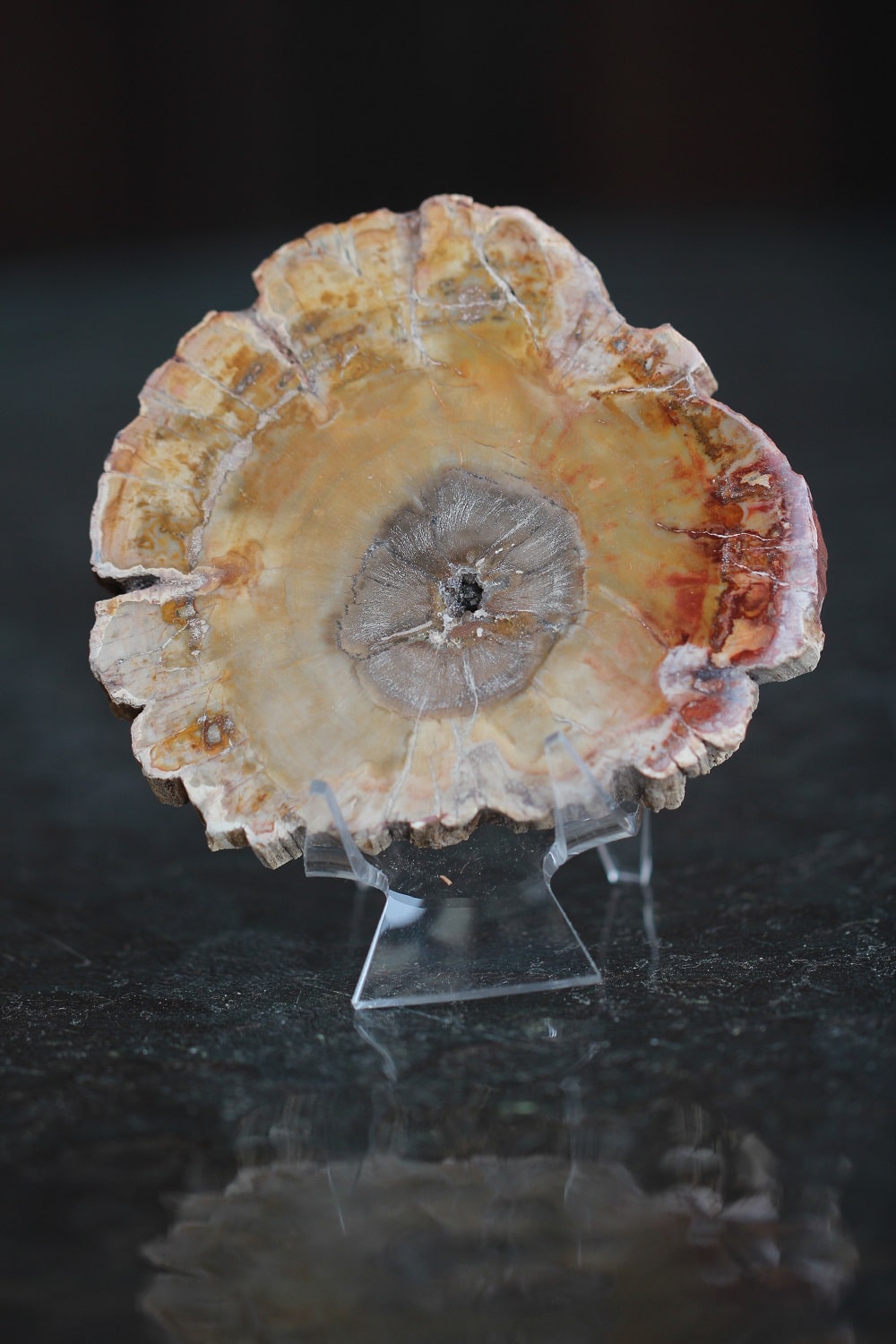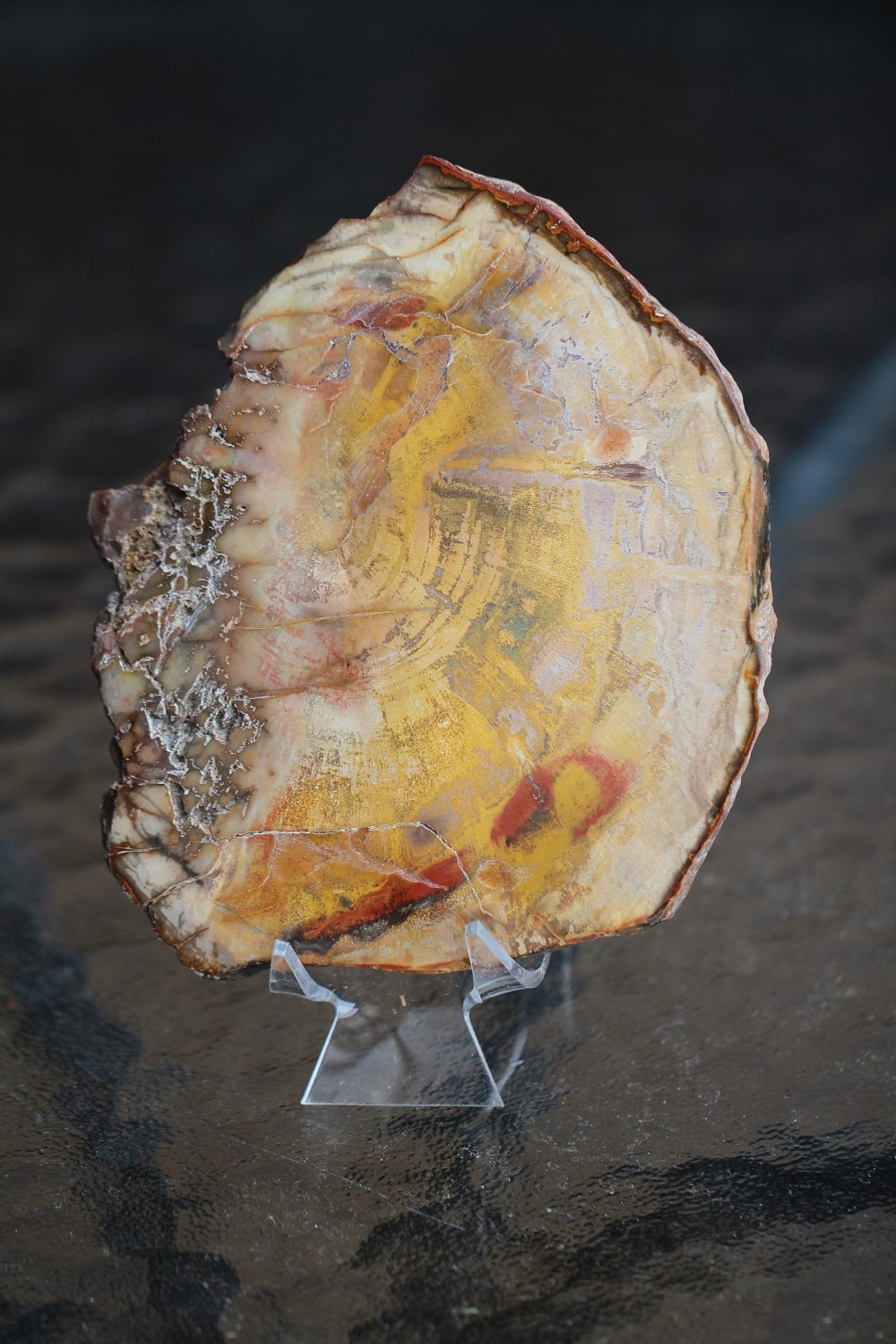 Madakaskari kivistunud puidust lõigatud ristlõikega plaat – see on tükike 250 miljoni aasta tagusest naturaalsest puidust ja tema transformatsioonist uude vormi kristallina.