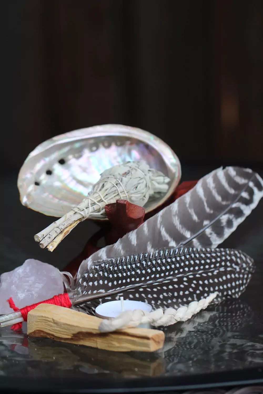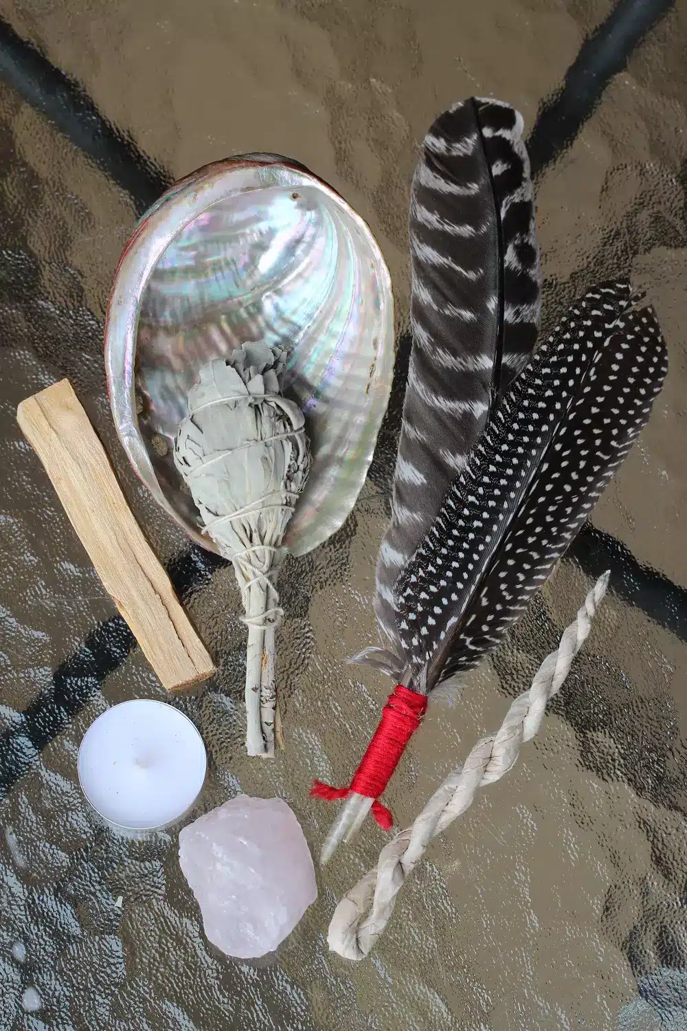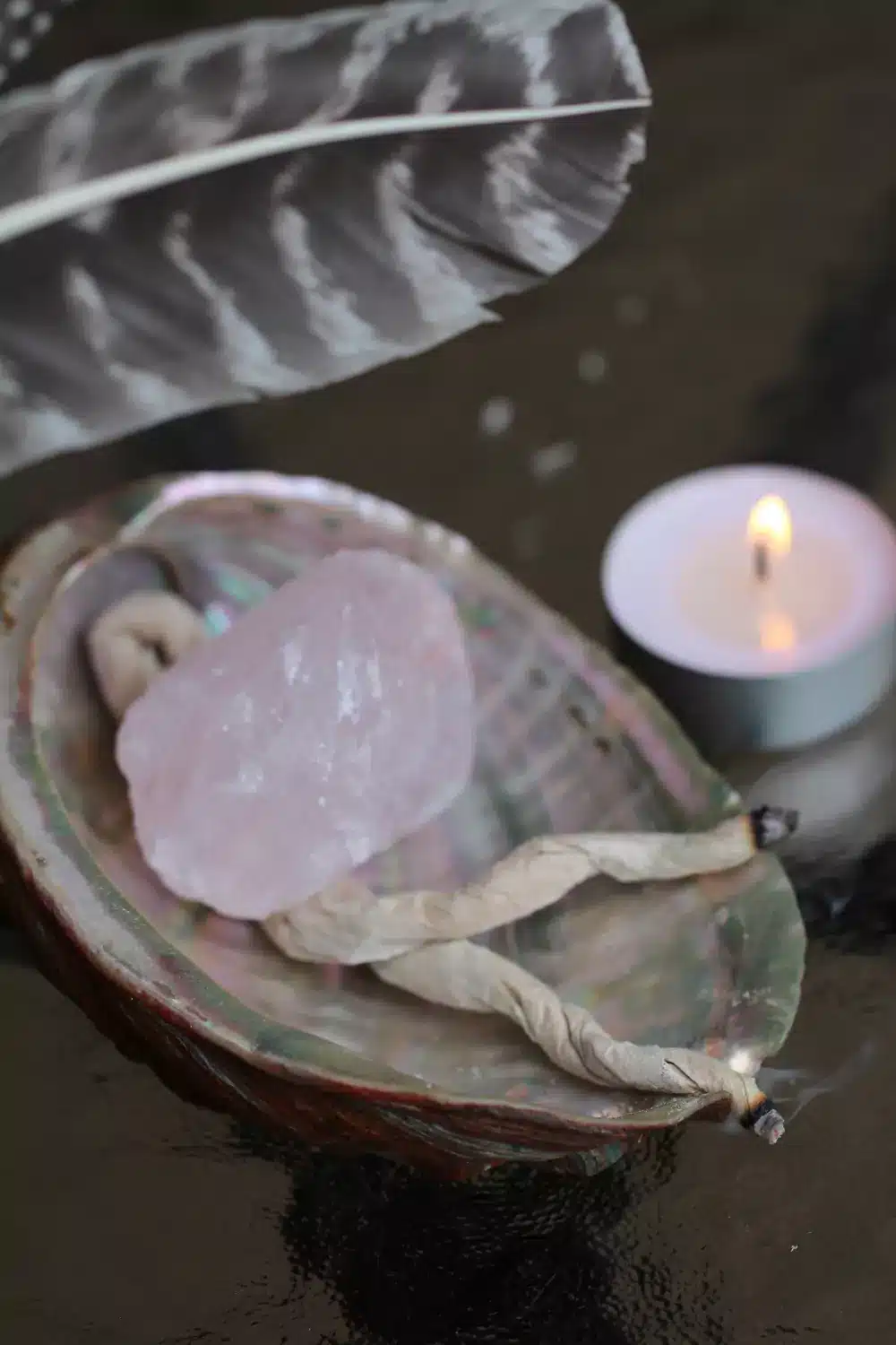 puhastusrituaali KOMPLEKT: valge salvei, abalone merekarp, palo santo, nöörviiruk, sulekomplekt, roosa kvartsi toorkivi ja palveleht