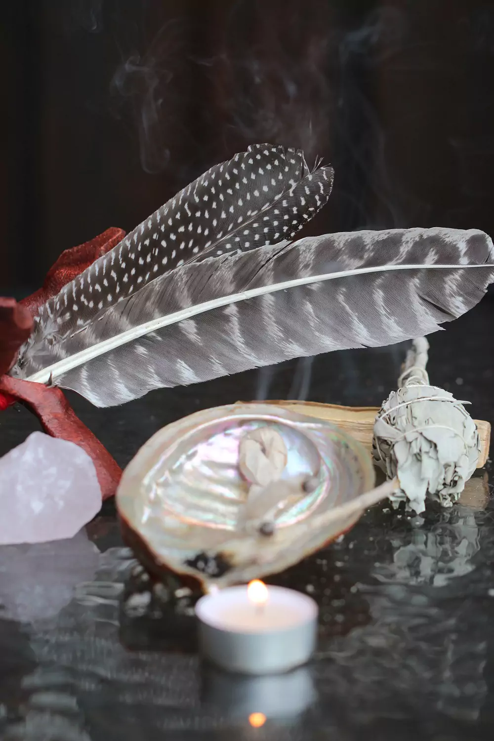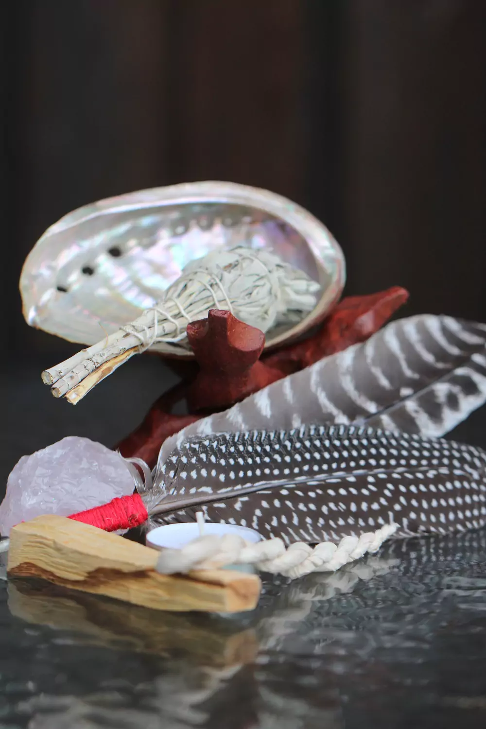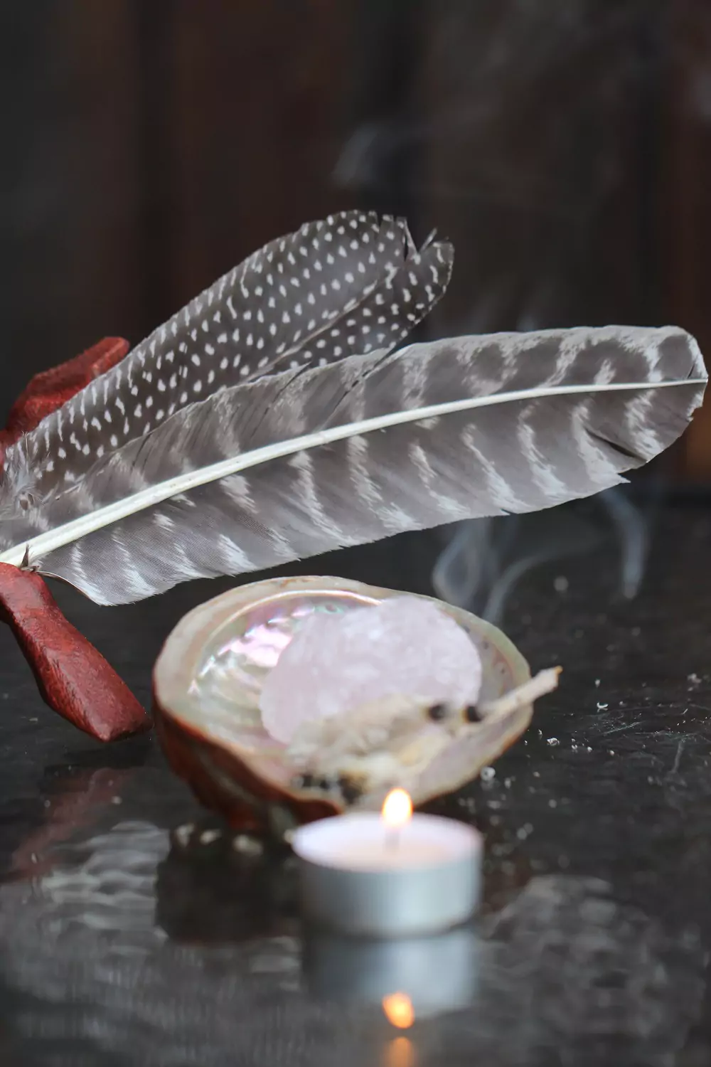 puhastusrituaali KOMPLEKT: valge salvei, abalone merekarp, palo santo, nöörviiruk, sulekomplekt, roosa kvartsi toorkivi ja palveleht