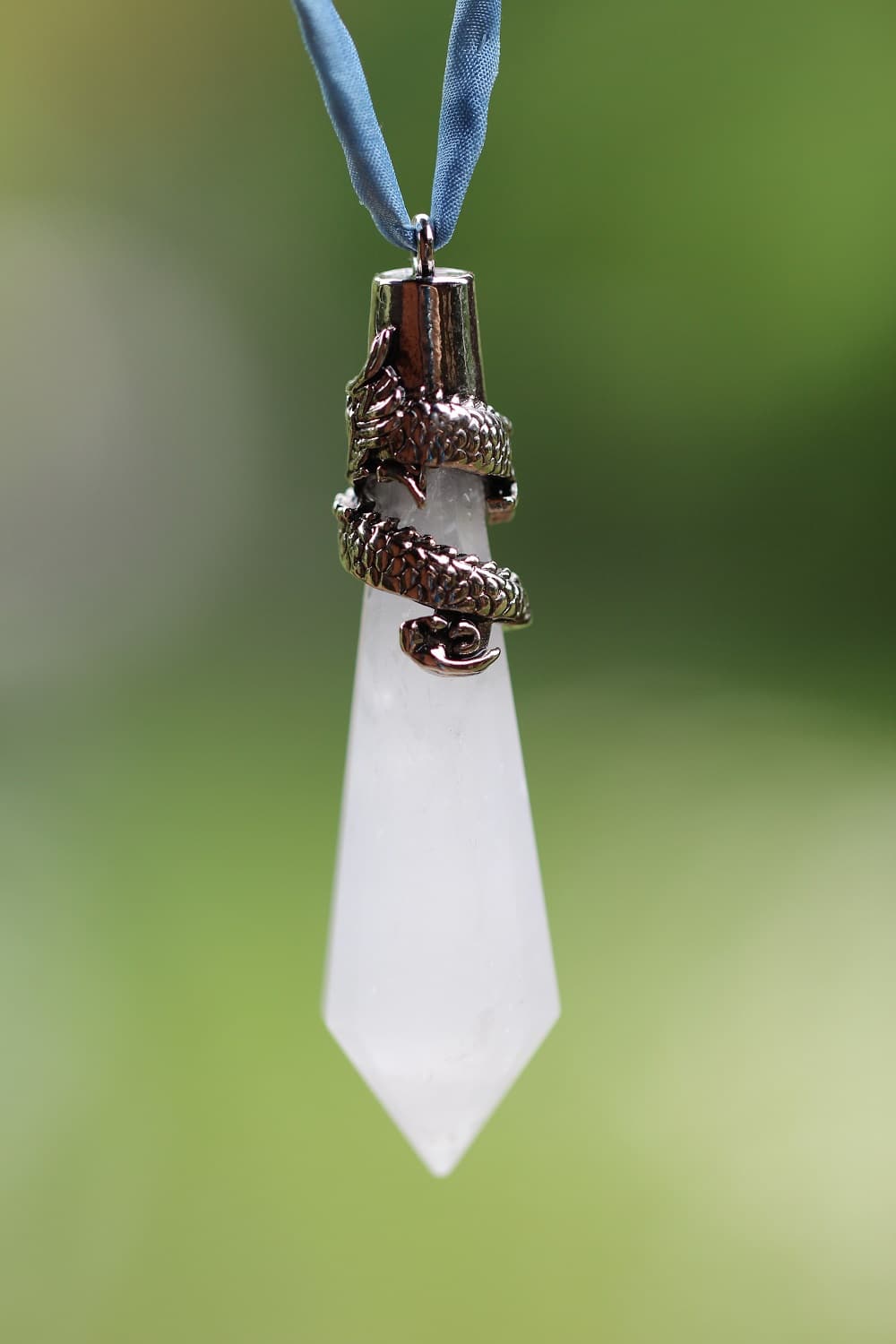 Kvaliteetsest valumetallist vormitud draakon, mis on keritud ümber mäekristallist 12-tahulise pikliku püramiidi. Ripats on omanäolise kujundusega ja sobib kaelakettidele (paeladele) läbimõõduga 3mm. Ripats on väga sobilik kasutamiseks pendlina.