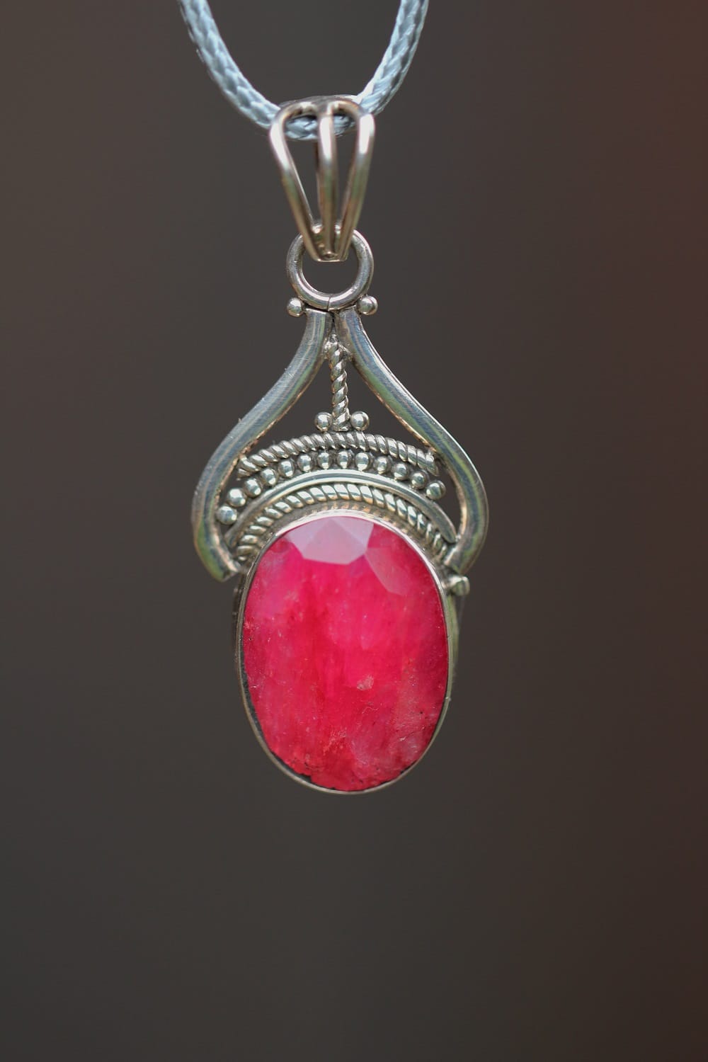 Käsitööna rubiinist ja hõbedast raami ning nikerdustega ripatsid toovad esile rubiini suursugusee iseloomu.
