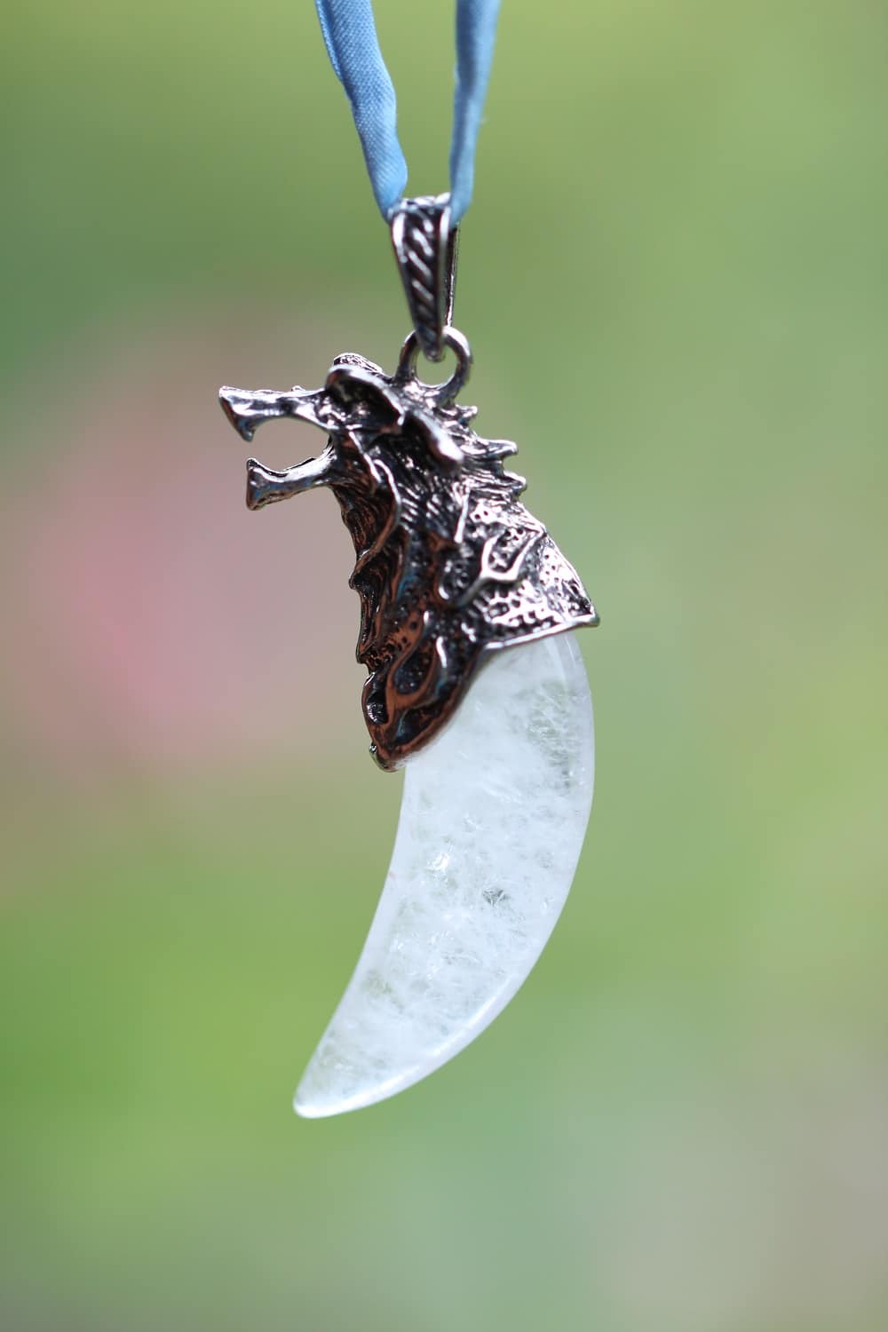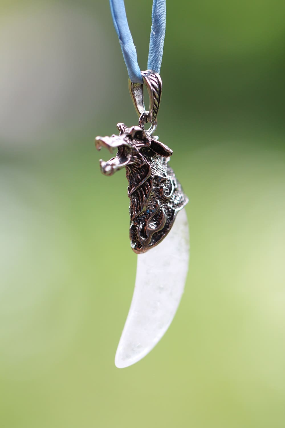 Kvaliteetsest messingust vormitud draakon, mis on kinnitatud mäekristallist poleeritud kuu kujulisele kristallile. Ripats on omanäolise kujundusega ja sobib kaelakettidele (paeladele) läbimõõduga 5mm.