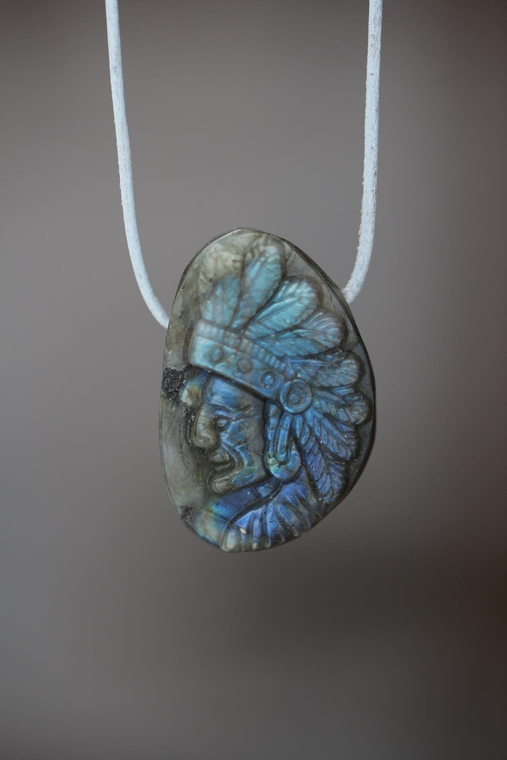 Käsitööna labradoriidist nikerdatud ripats kujutab indiaani shamaani või tarka.
