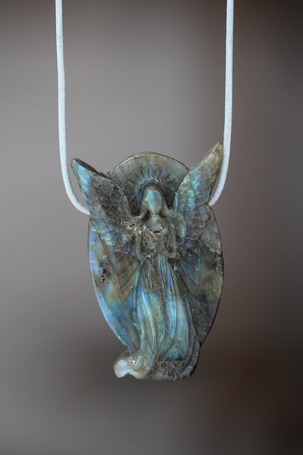 Käsitööna labradoriidist nikerdatud ripats kujutab inglit.