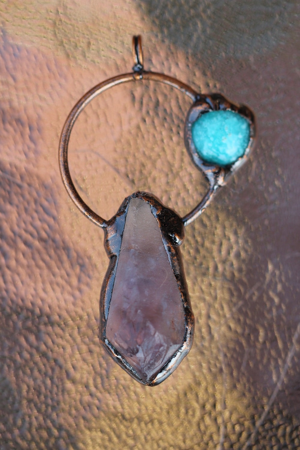 Messinguga äärtest kaetud ametüsti ja amasoniidi ripats on omanäoliselt kujundusega ja võimalusel kasutamiseks erinevate aksessuaaridega.
