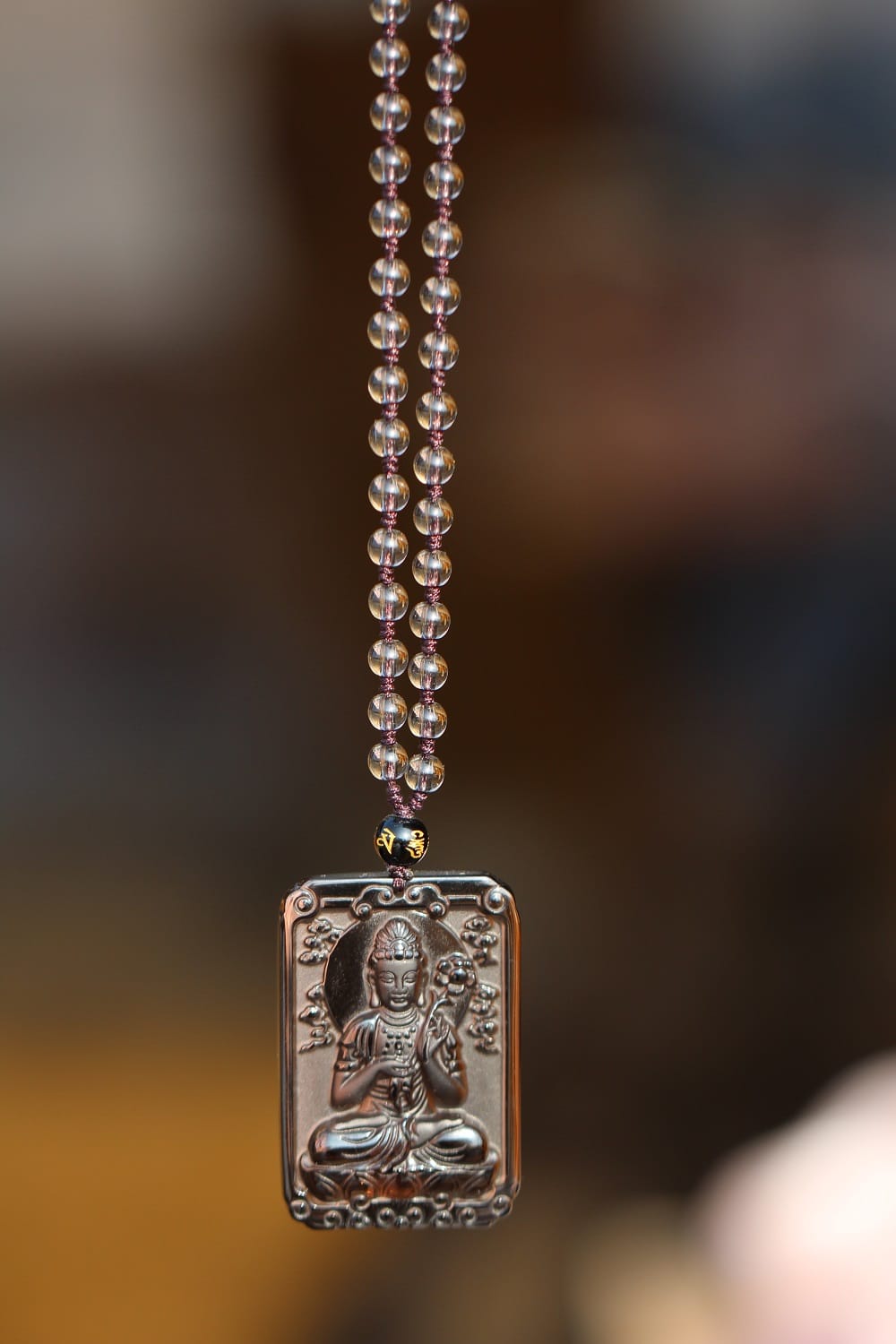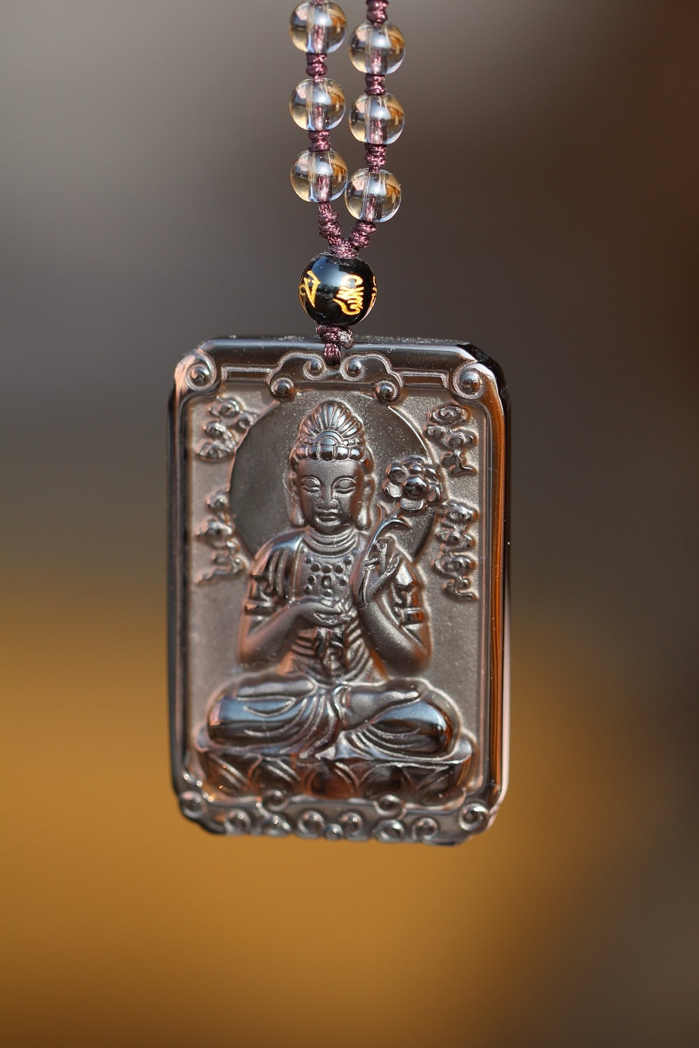 Käsitööna läbipaistvast mustast obsidiaanist nikerdatud ripatsil on kujutatud BUDDHA’t.