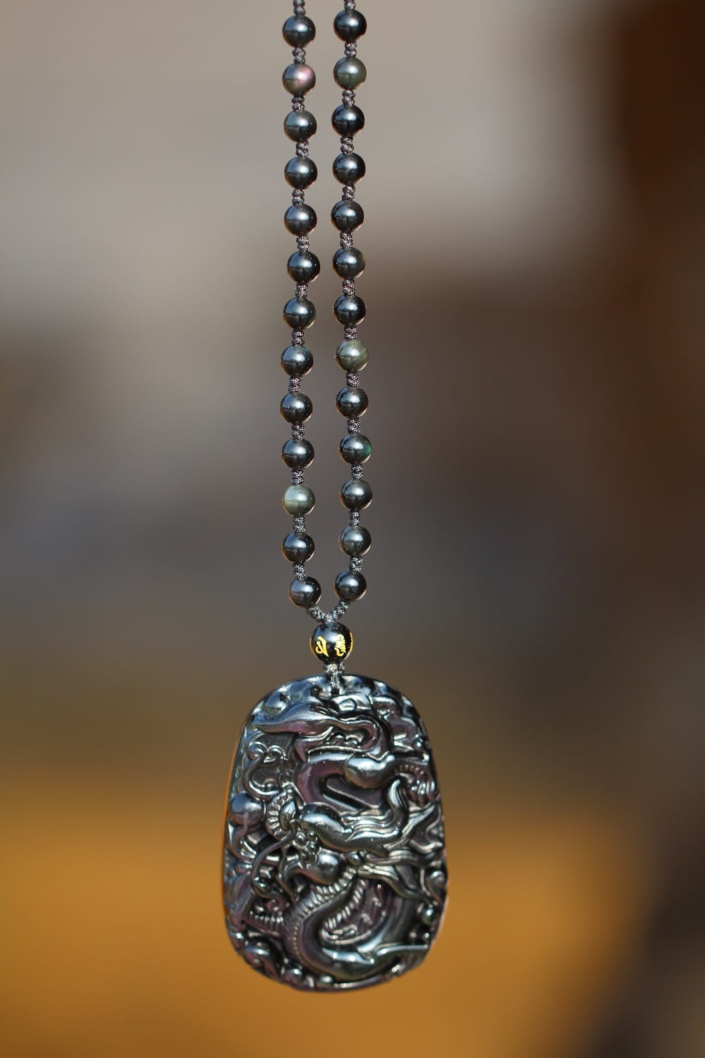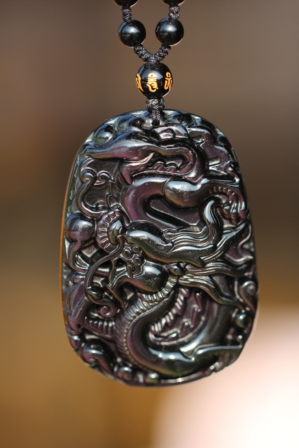 Käsitööna vikerkaare obsidiaanist nikerdatud ripats kujutab draakonit.