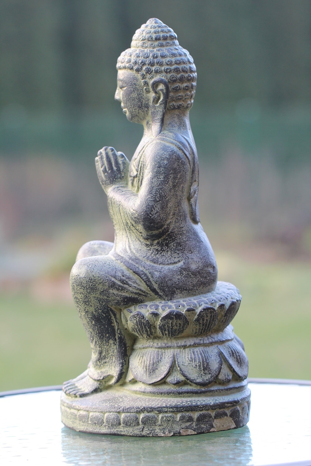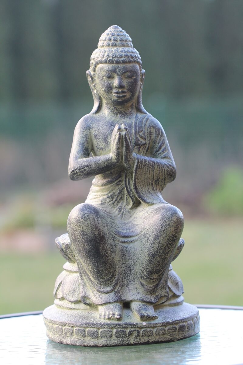 Liivavalust valmistatud palvetav Buddha kuju roheka tooniga on efektne sisekujunduselement nii sise kui ka välisruumidesse ning altarile.