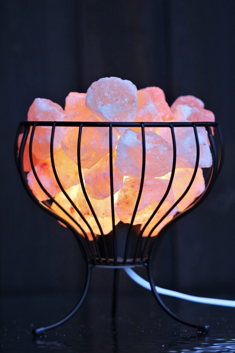 Roosa haliidi (himaalaja soolakristalli) toorkividega (4-5cm tk) täidetud metall-traadist (värvitud musta matt-värviga) punutud korvlamp.