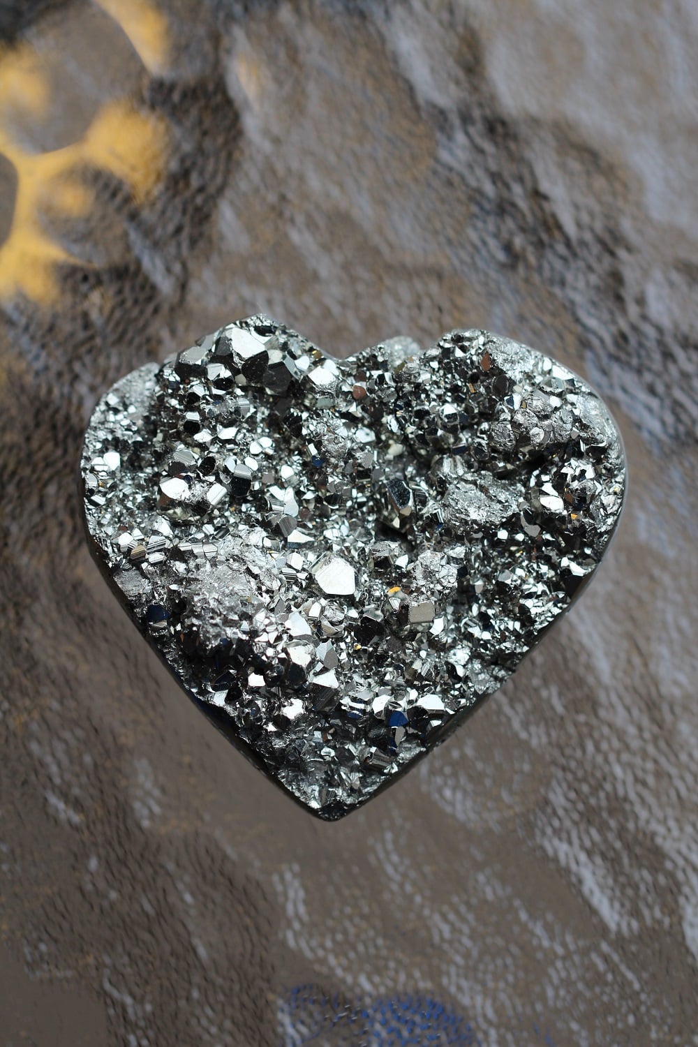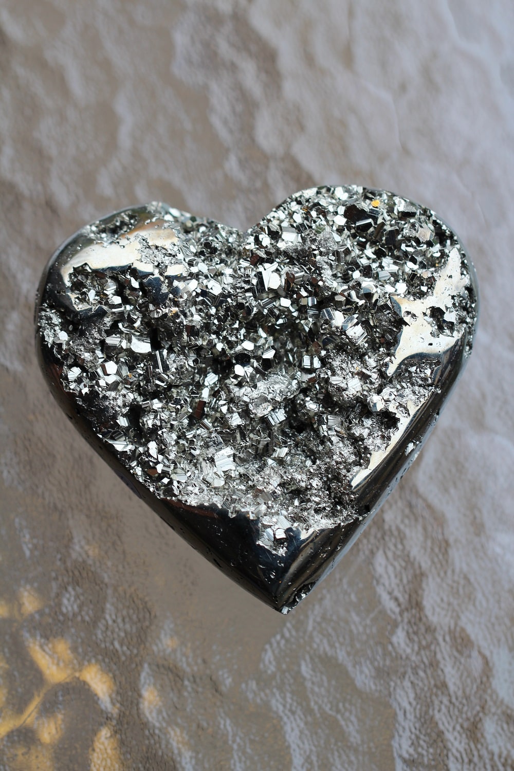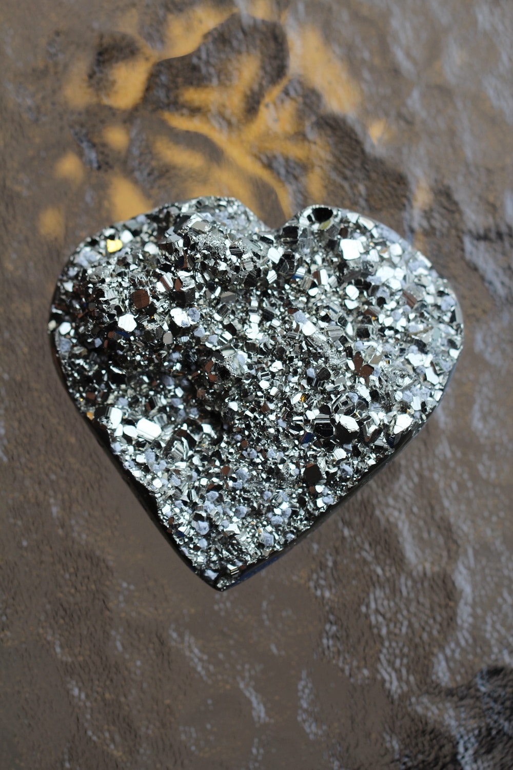 Looduslikust püriidist pealt geoodilise struktuuriga ja altpoolt poleeritud efektsed südamed ei jäta kedagi külmaks – kristall oma täiuslikkus säras.
