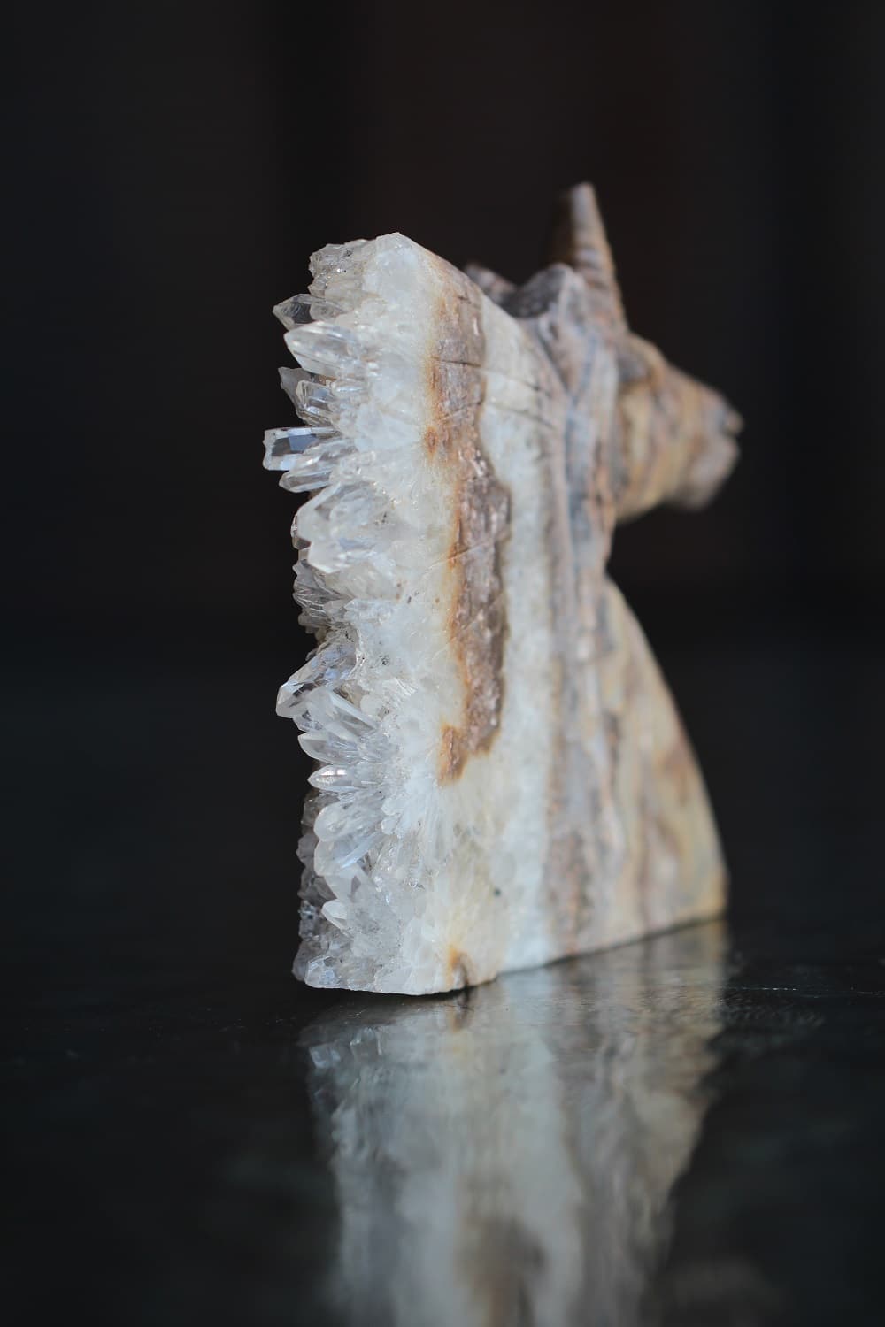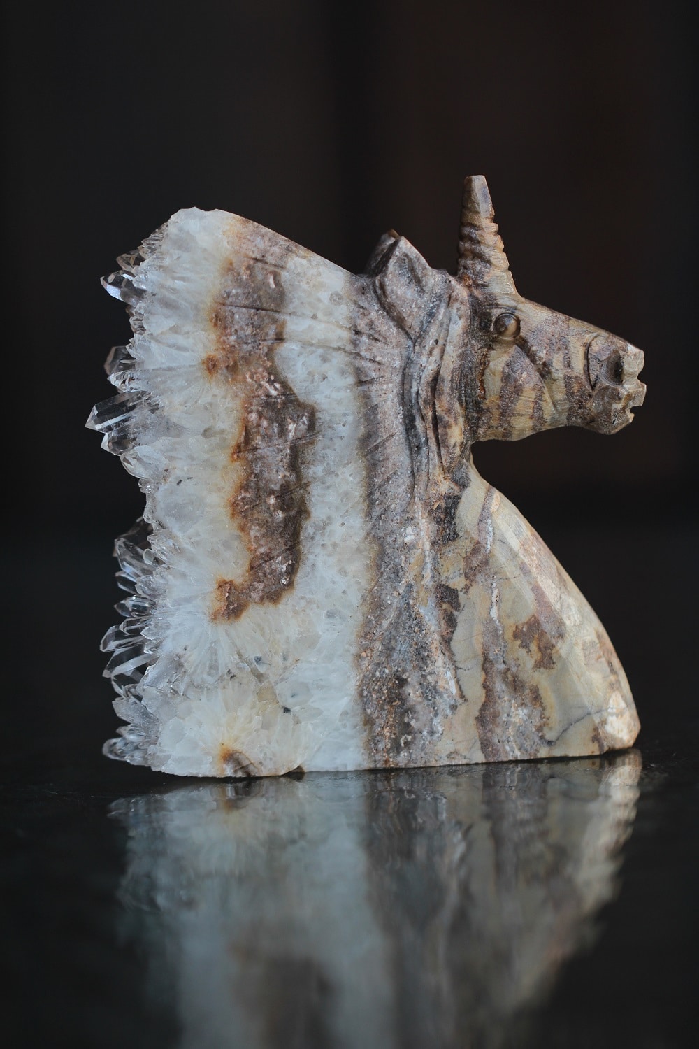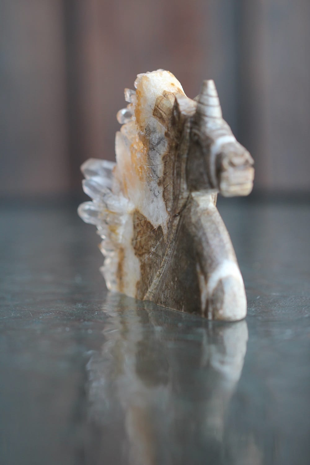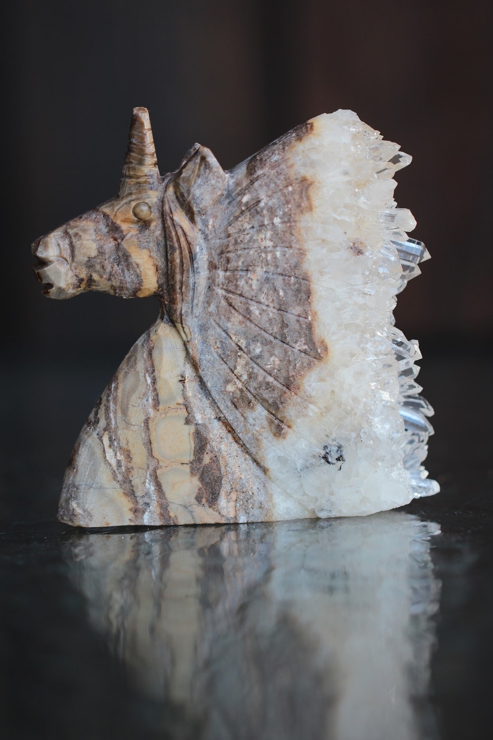 Ükssarviku kuju on tahutud mäekristalli baaskivimist ja ükssarviku seljal on mäekristalli naturaalsed tipukesed kobarana.