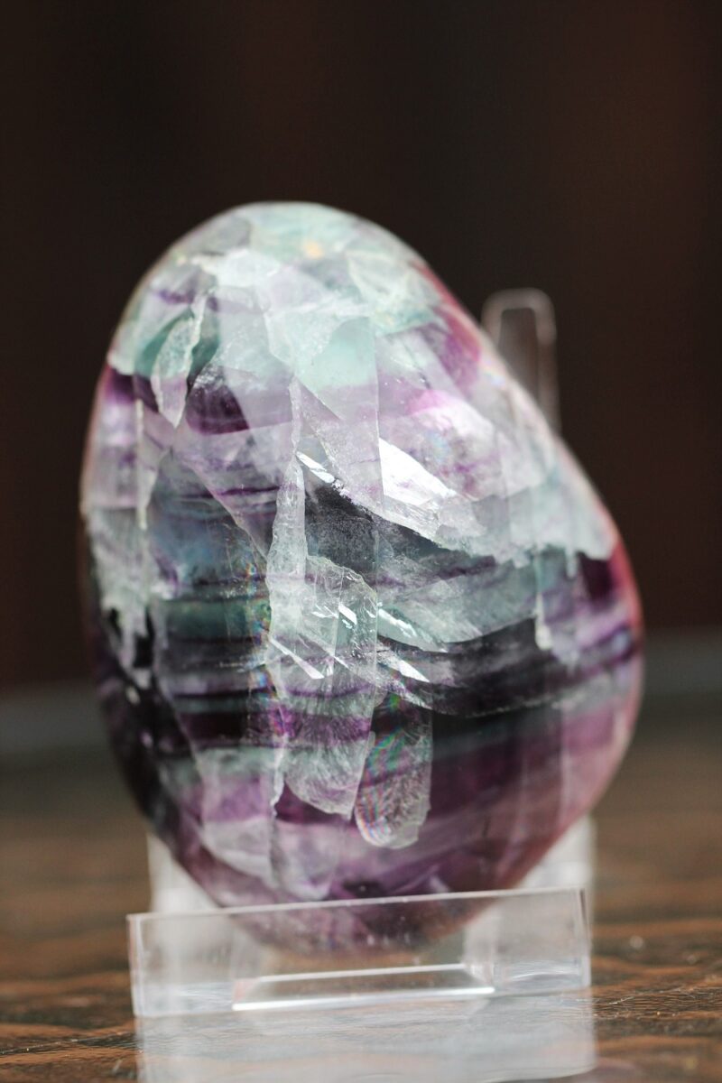 Fluoriit sisaldab selliseid värve nagu lilla, sinine, roheline, läbipaistev ja kollane ja selles kristallis on nende värvide omadused kõik segunenud.
