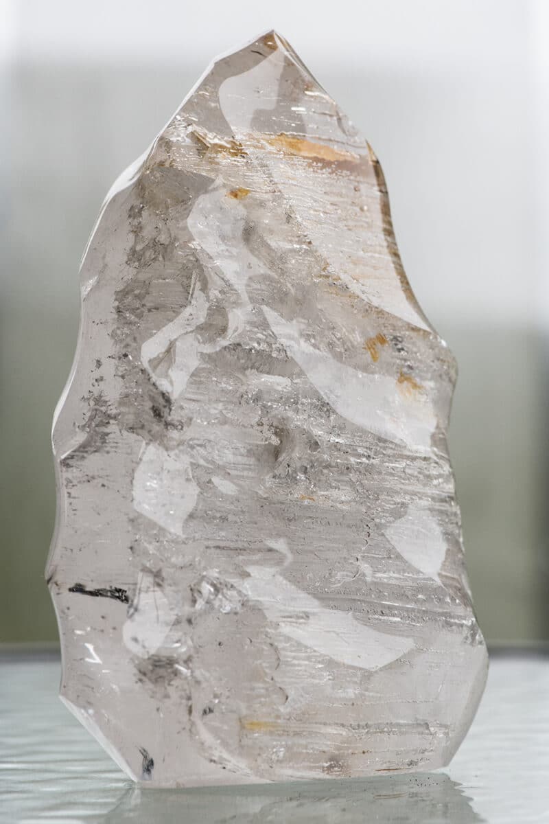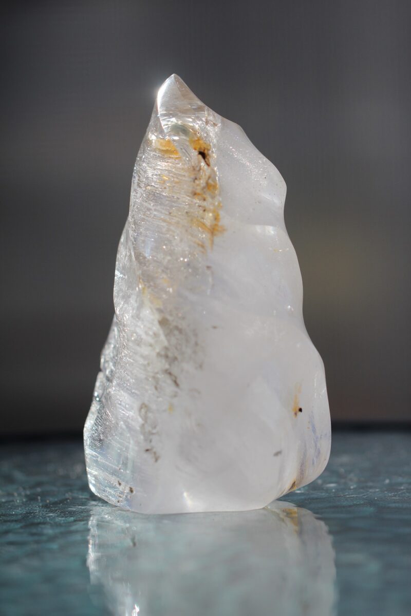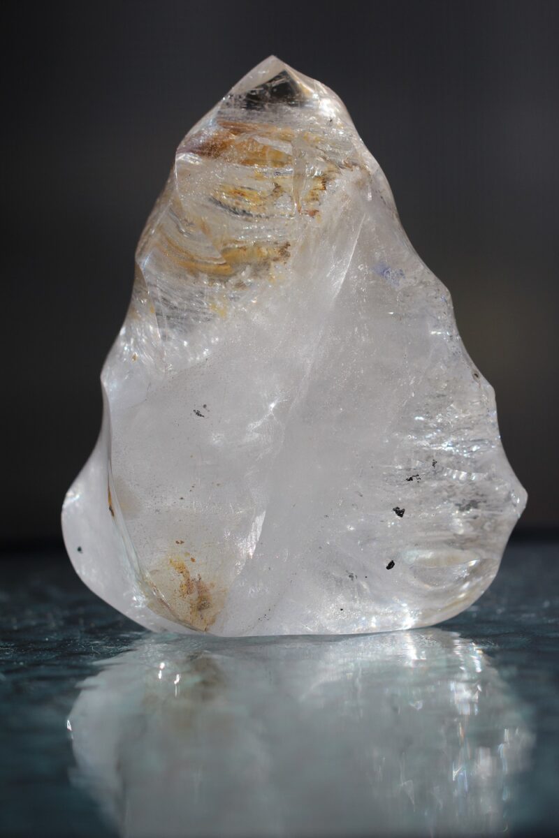 See mäekristalli vabavorm on vormitud leegi kujuliseks, erinevad sisemised avaused ja suletised annavad vabavormile eripäraseid valguse peegeldusi ja varje.
