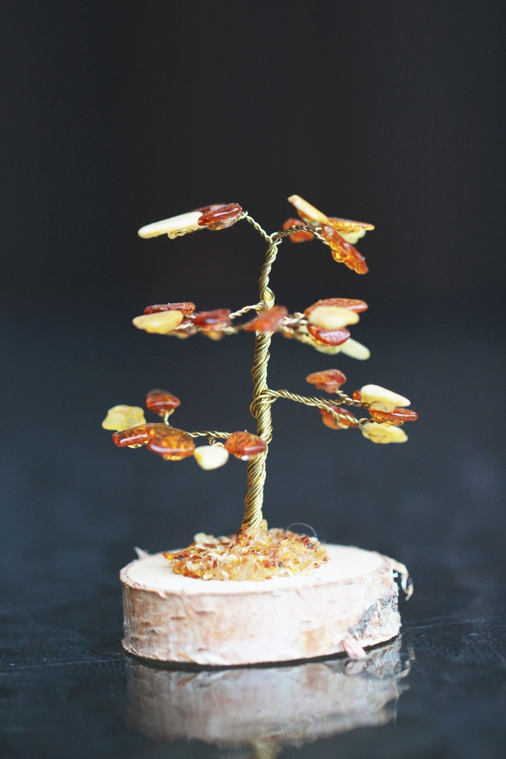 Merevaigu tükikesed on kinnitatud traadist punutud okstele, mille võra kinnitub väiksele kaselaastule.