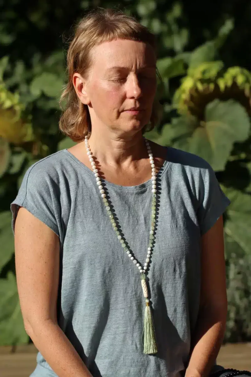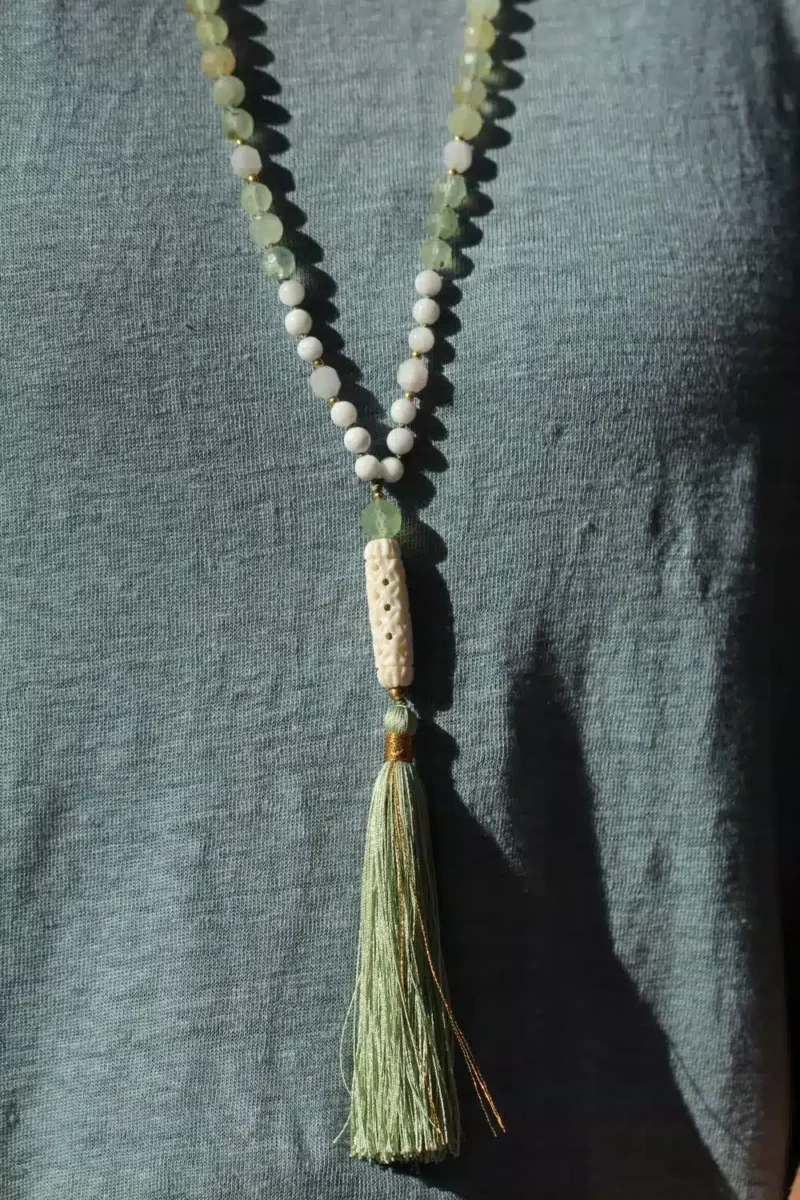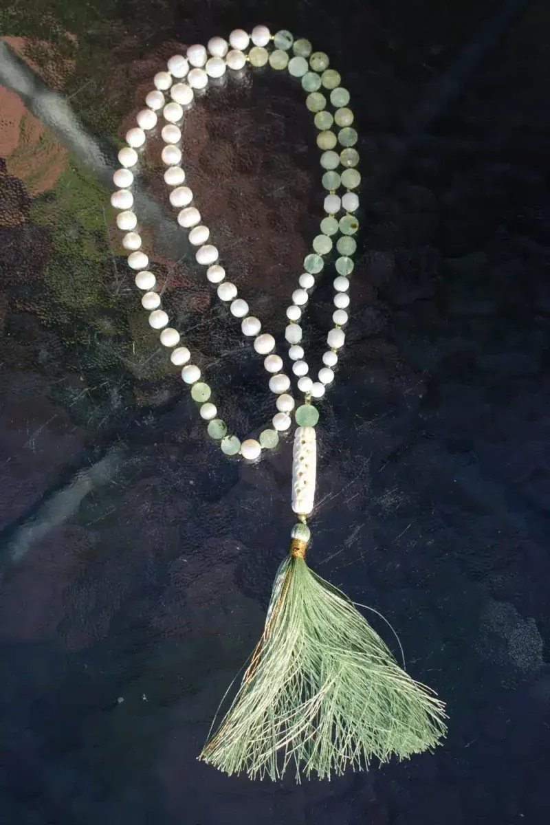 Magevee pärl, preniit, kuukivi, luu, kullatud hõbe ja siid