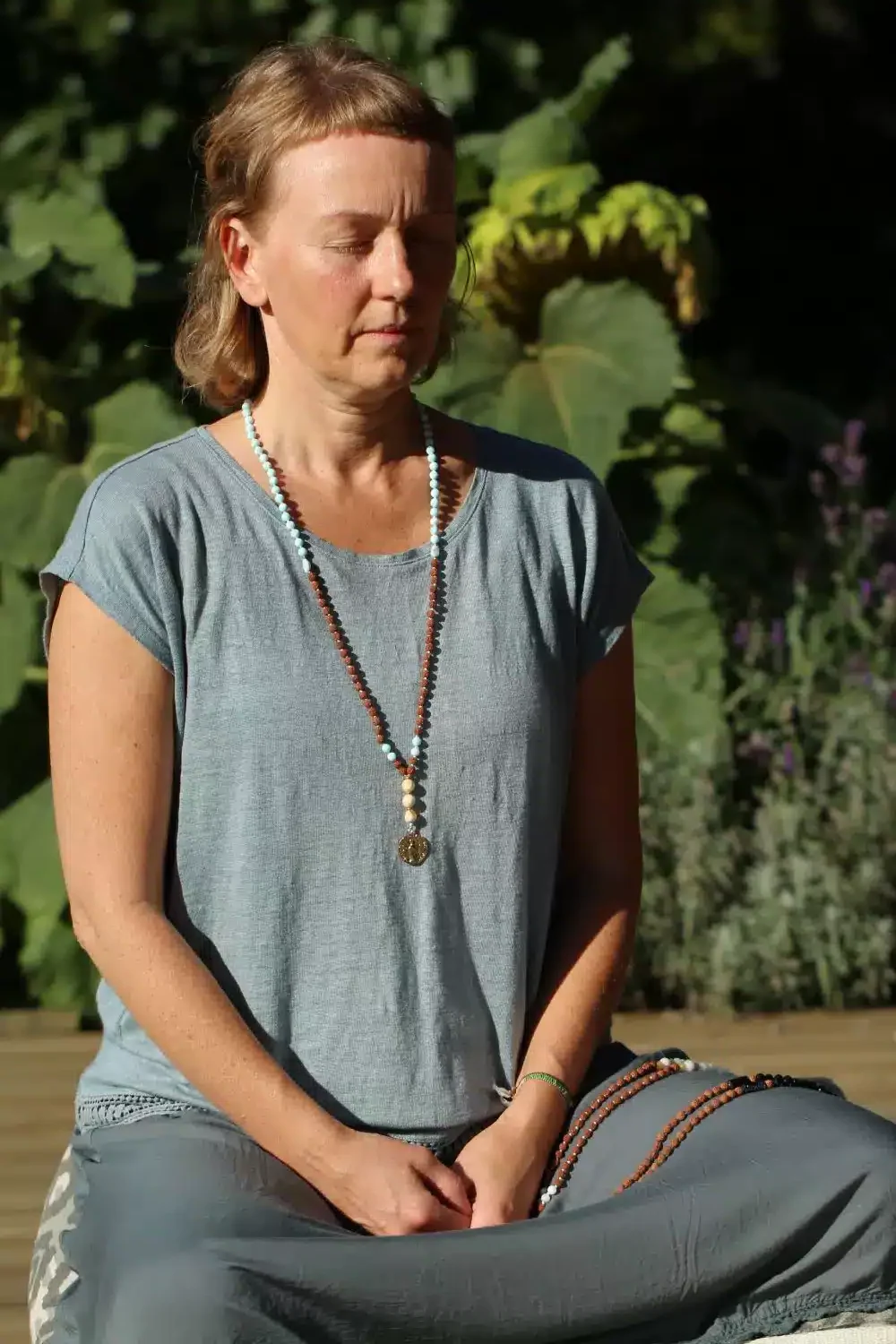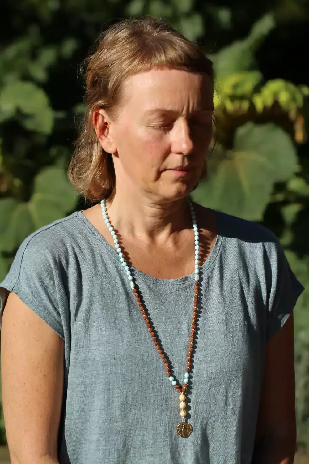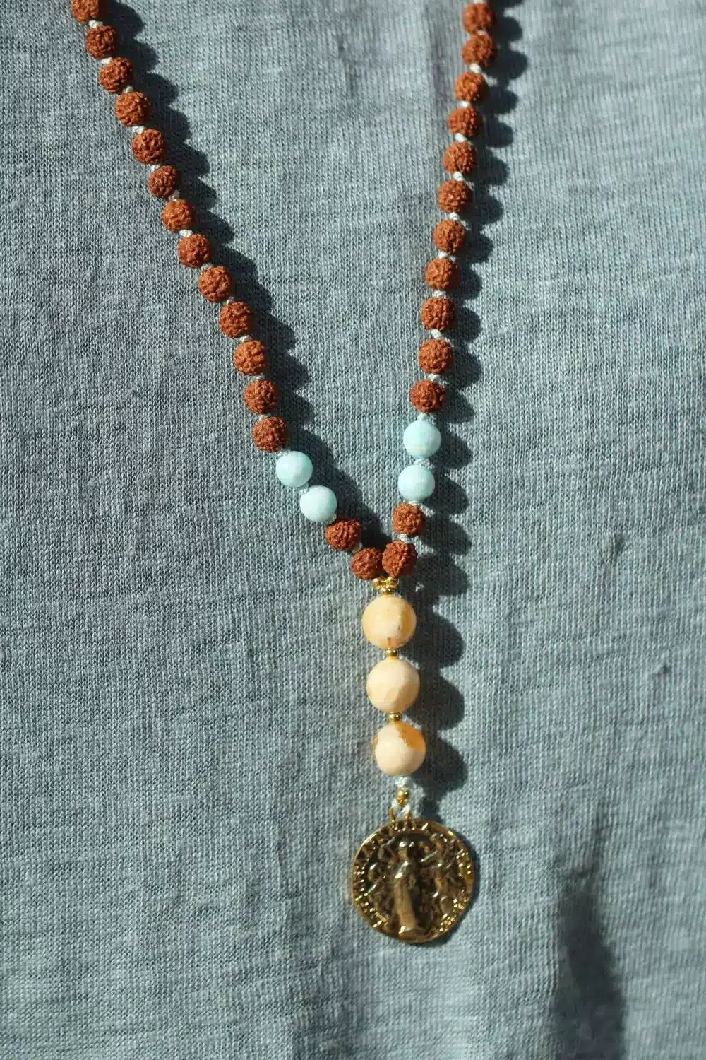18K kullatud messing püha õde ripats, hemimorfiit, larimar, viiruki helmed, rudraksha, kullatud hõbe ja siid.