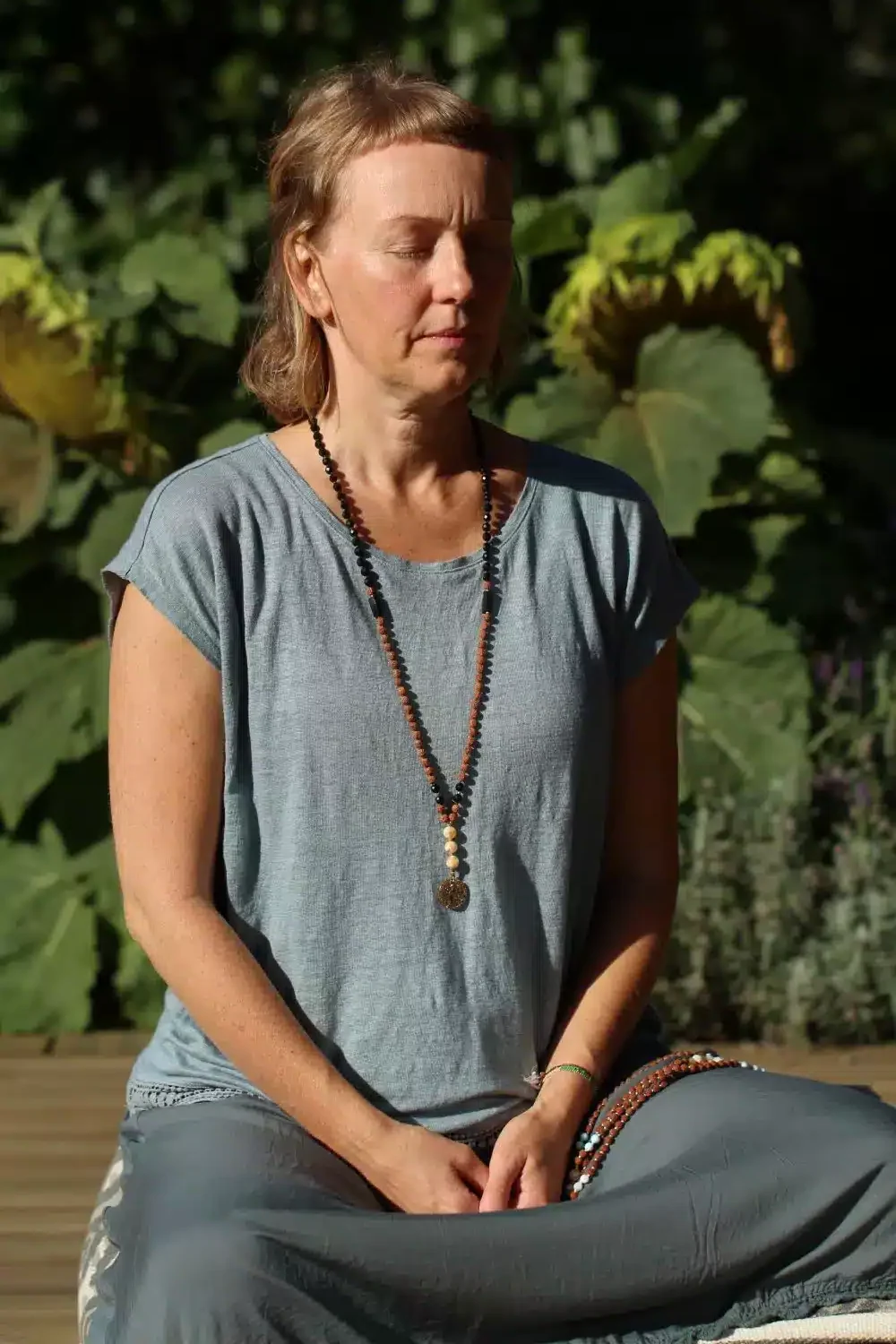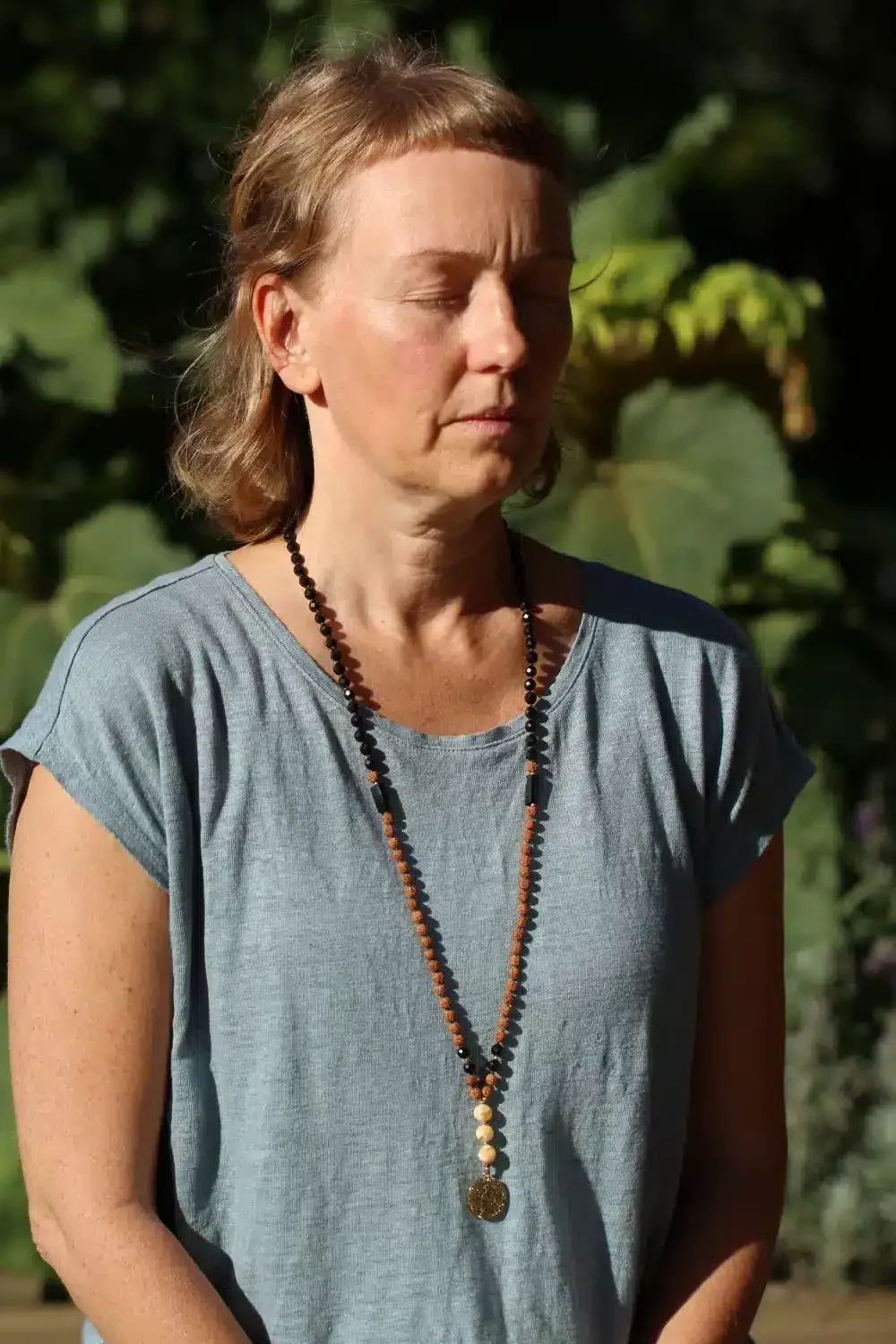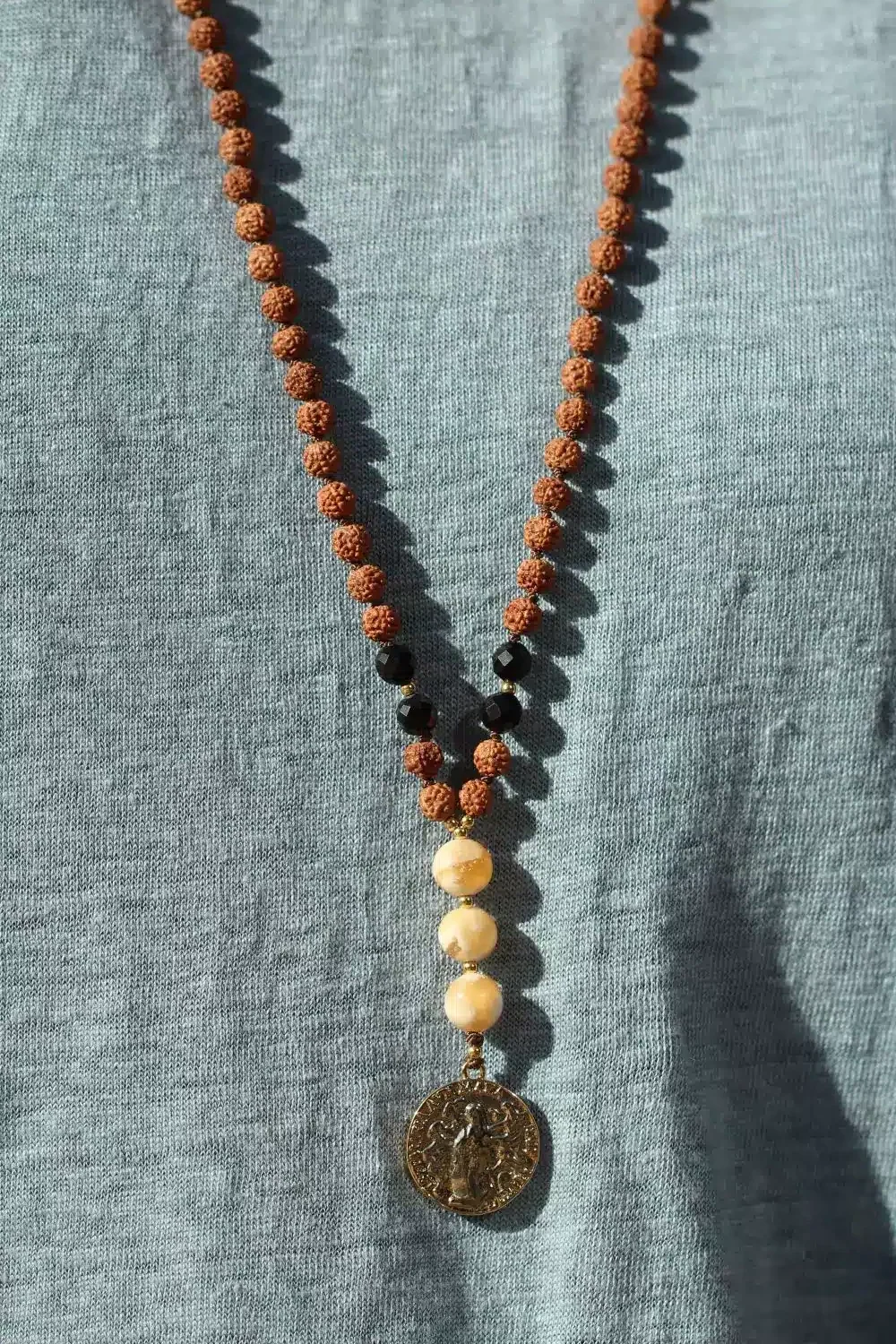 18K kullatud messing püha õde ripats, must oonüks, must turmaliin, viiruki helmed, rudraksha, kullatud hõbe ja siid