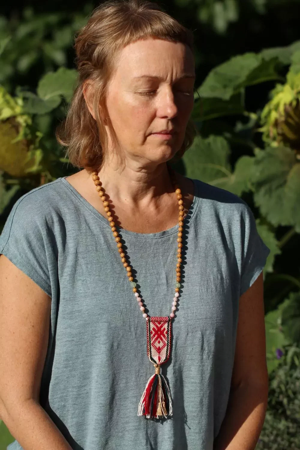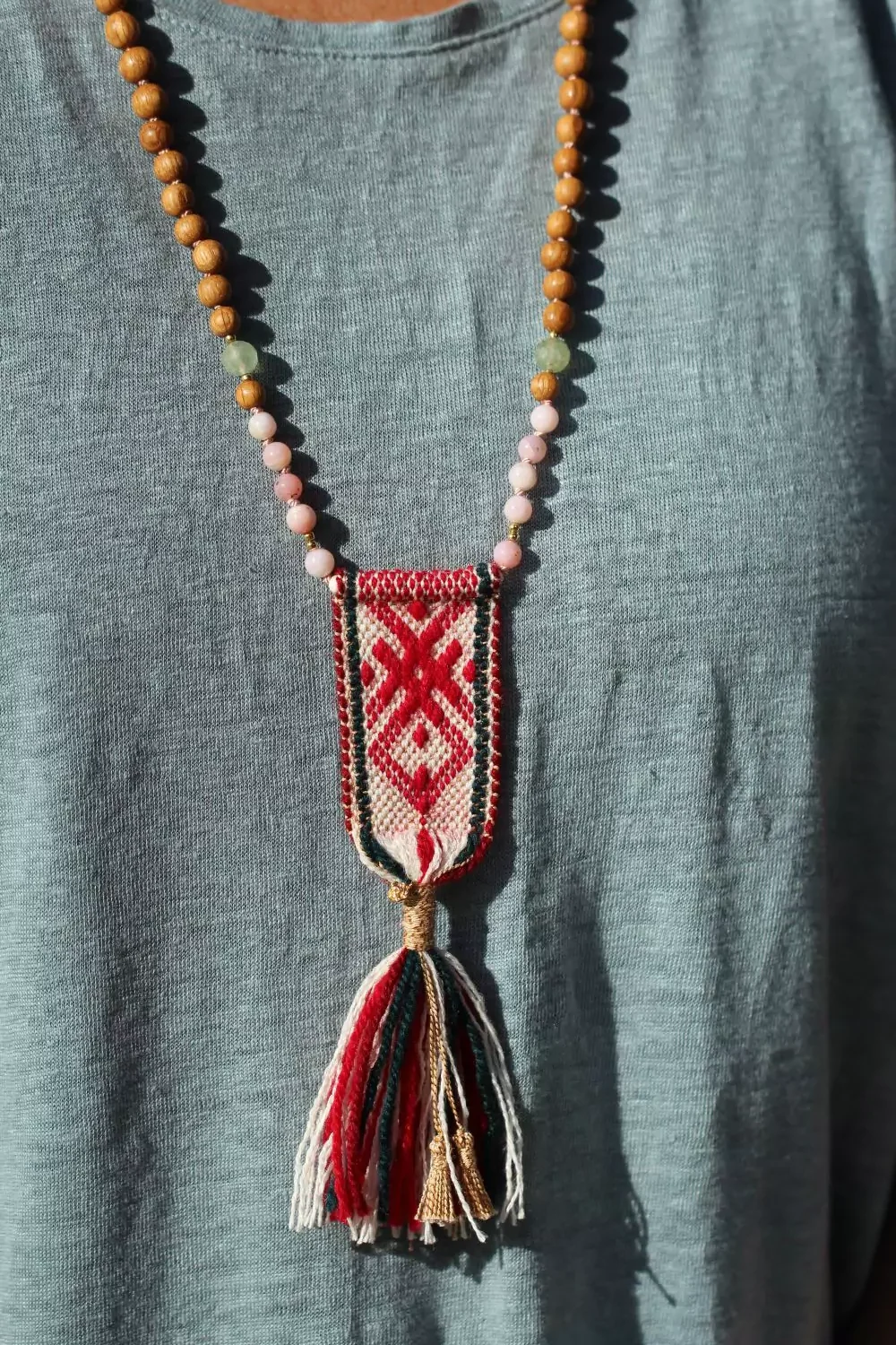 Tamm, preniit, roosa opaal, kullatud hõbe ja siid.