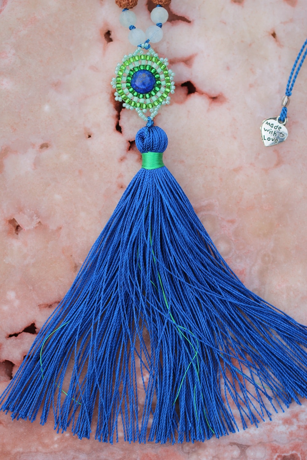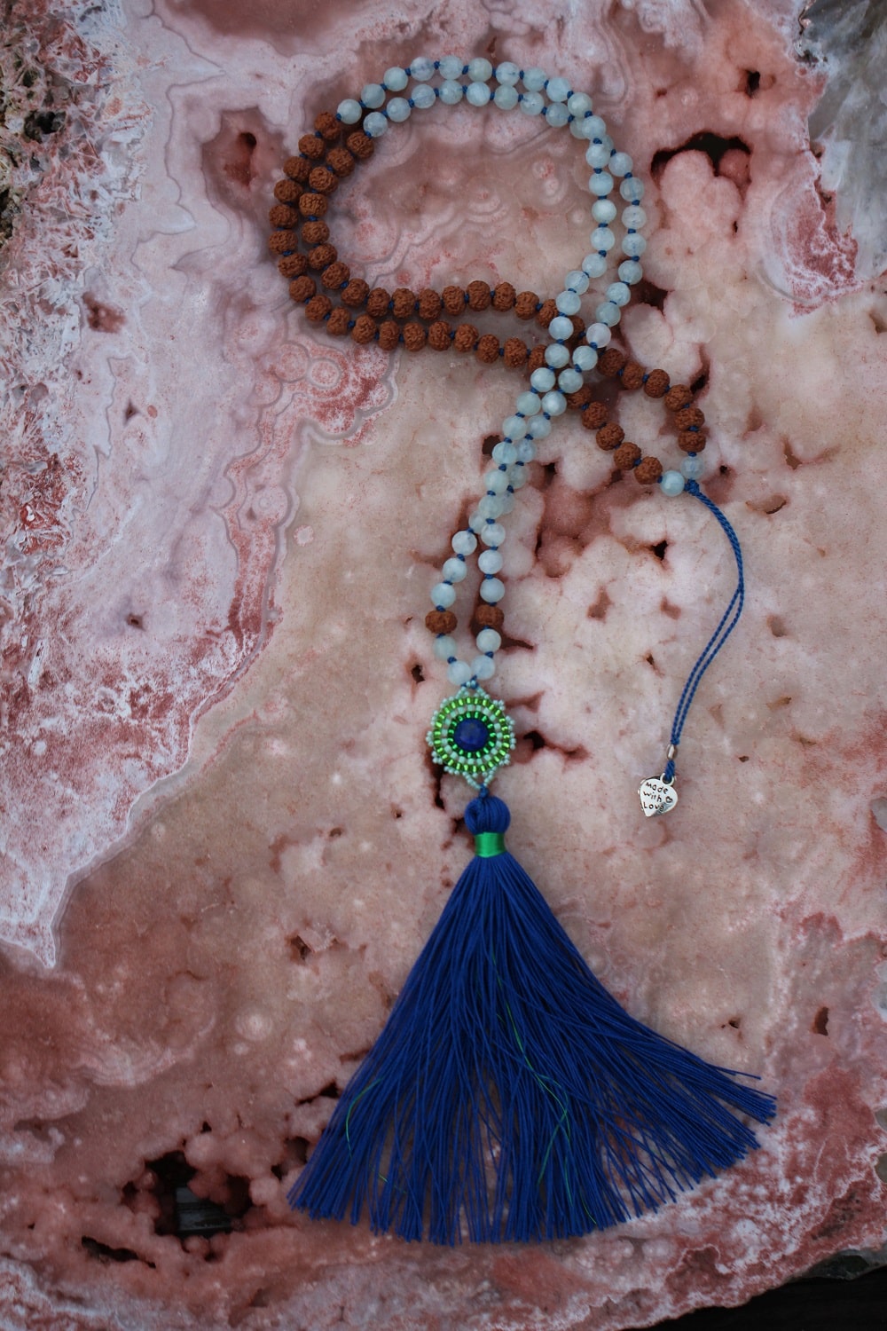 Väekees on kokku punutud helmestikand, lasuriit, akvamariin, rudraksha ja siid.