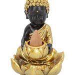 Rahulik väike Buddha istub ristatud jalgadega kuldse lootose sees. Ta hällitab väiksest lootoseõit, kuhu saab asetada lõhnakoonuse.