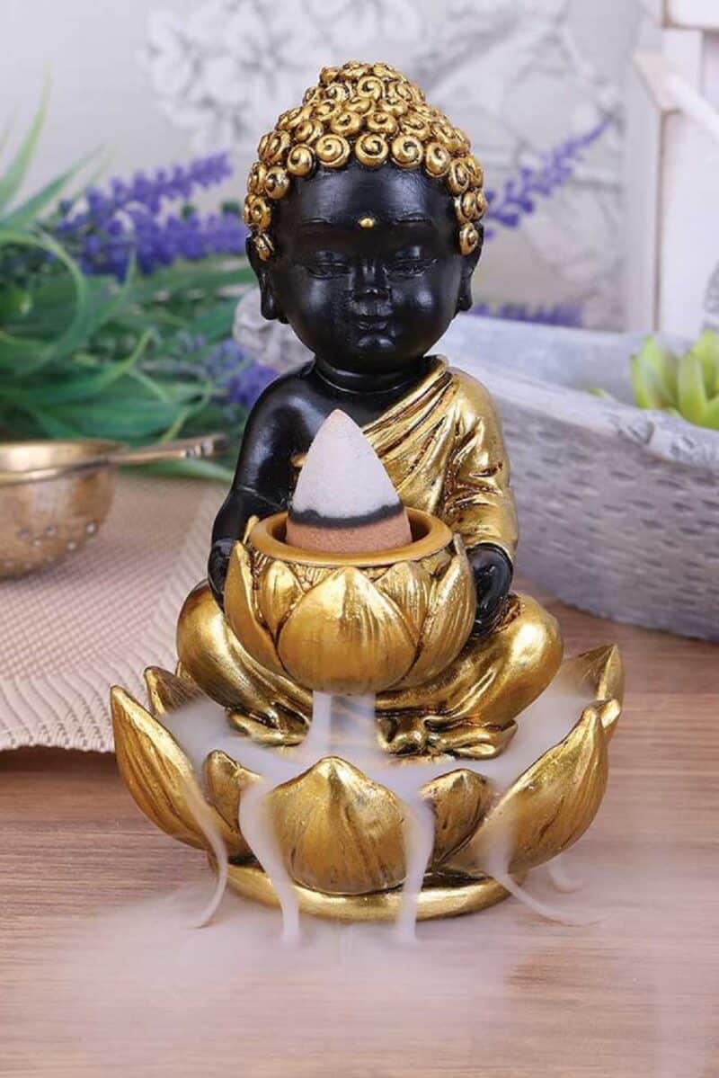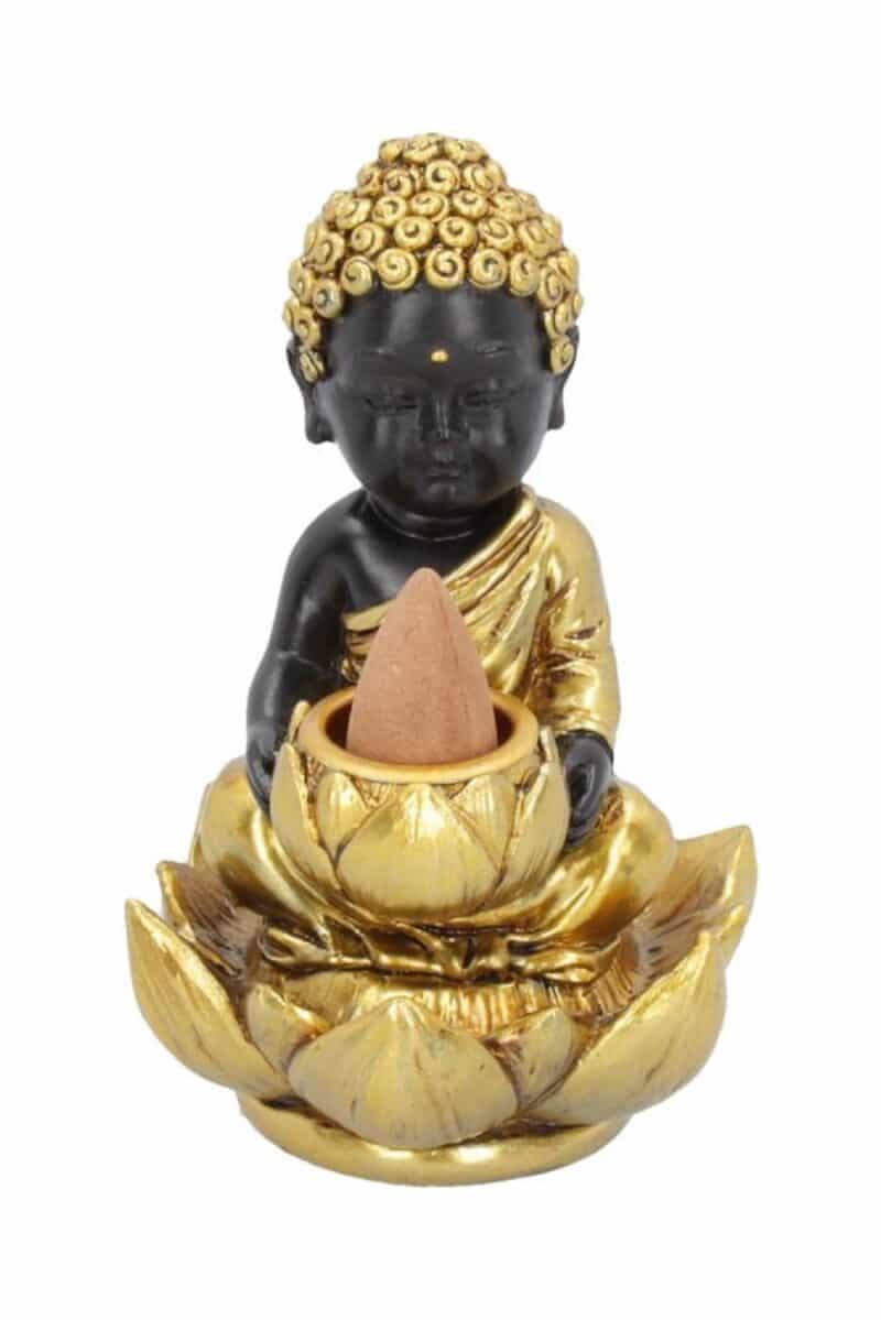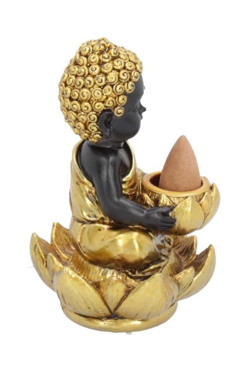 Rahulik väike Buddha istub ristatud jalgadega kuldse lootose sees. Ta hällitab väiksest lootoseõit, kuhu saab asetada lõhnakoonuse.