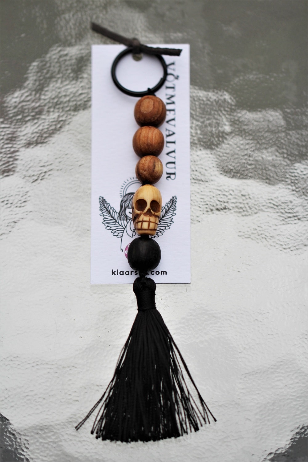 See võtmevalvur on loodud eestimaisest pihlakast, mustast tammest ja luust (pealuu) ning ehitud siiditutiga.